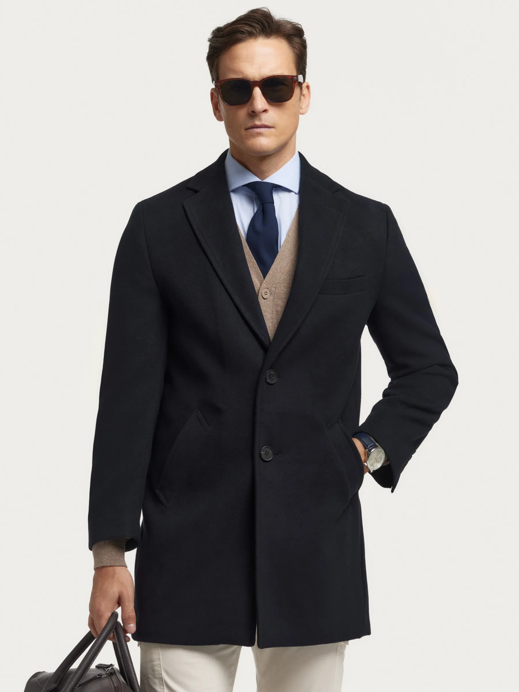 Abrigo de paño liso con cuello y solapa. Cierre central mediante botones, manga larga con botones en su terminación y dos bolsillos a la altura de la cintura. Abertura central en el bajo de la espalda. Corte regular fit.