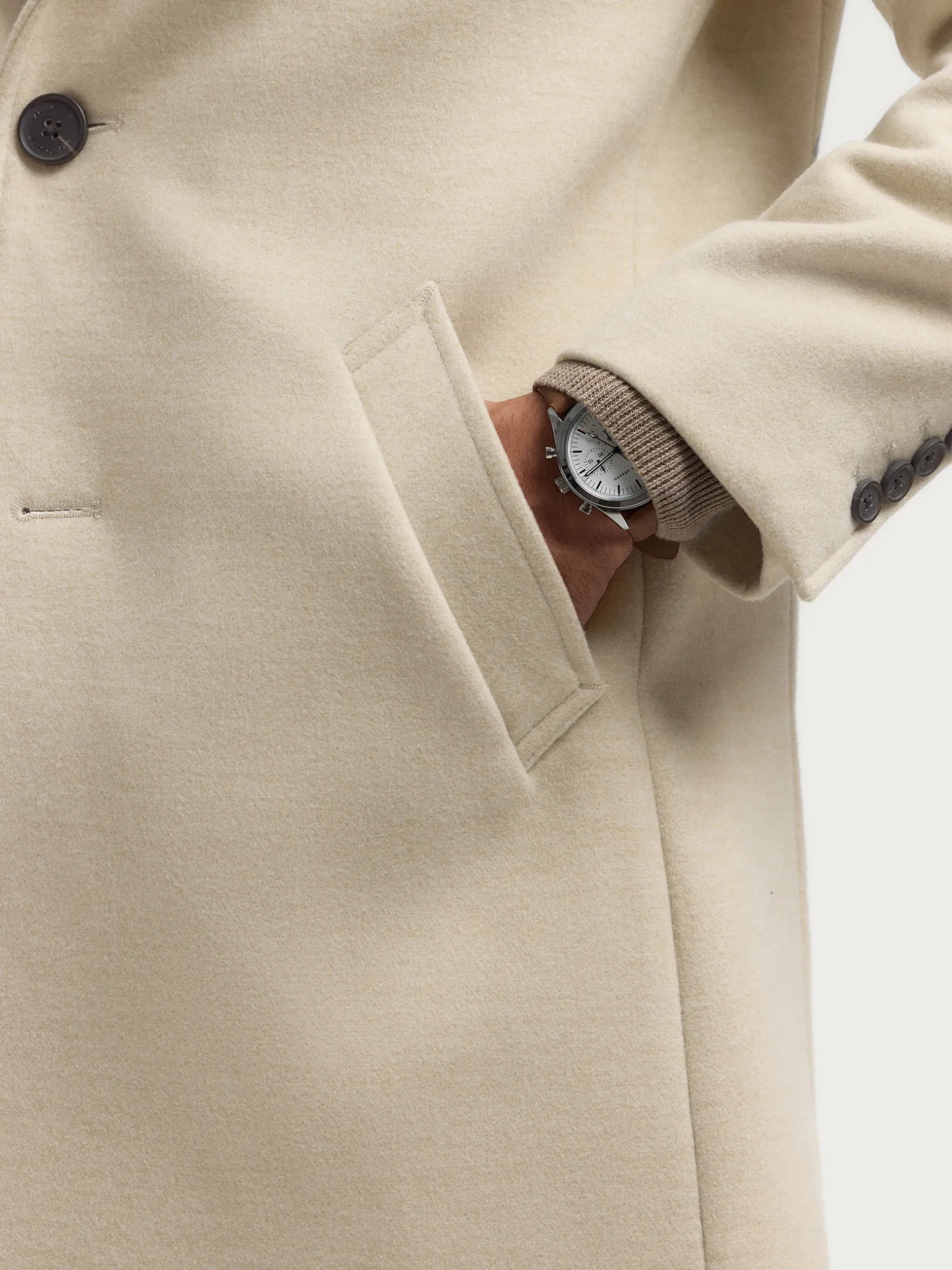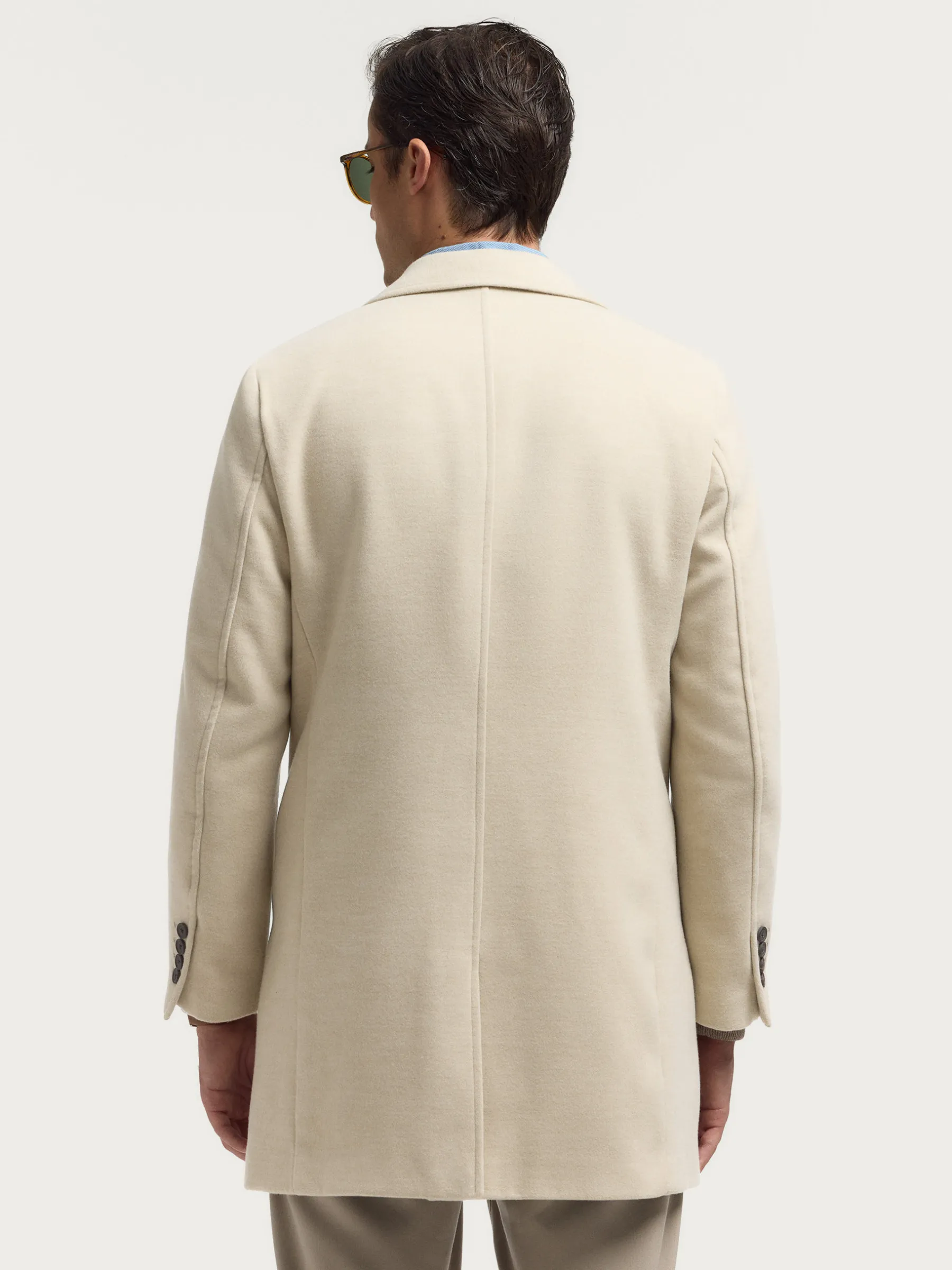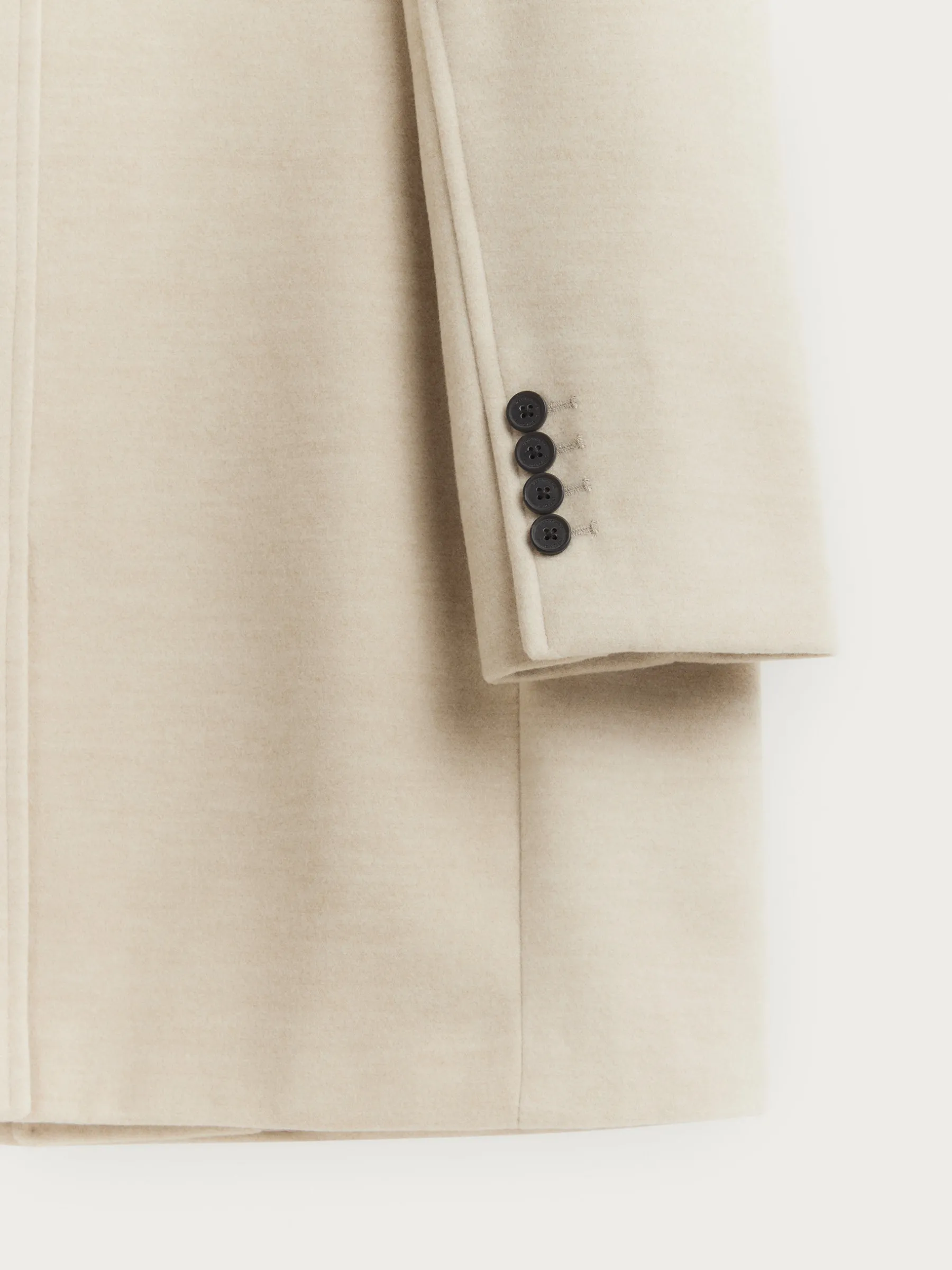 Abrigo de paño liso con cuello y solapa. Cierre central mediante botones, manga larga con botones en su terminación y dos bolsillos a la altura de la cintura. Abertura central en el bajo de la espalda. Corte regular fit.