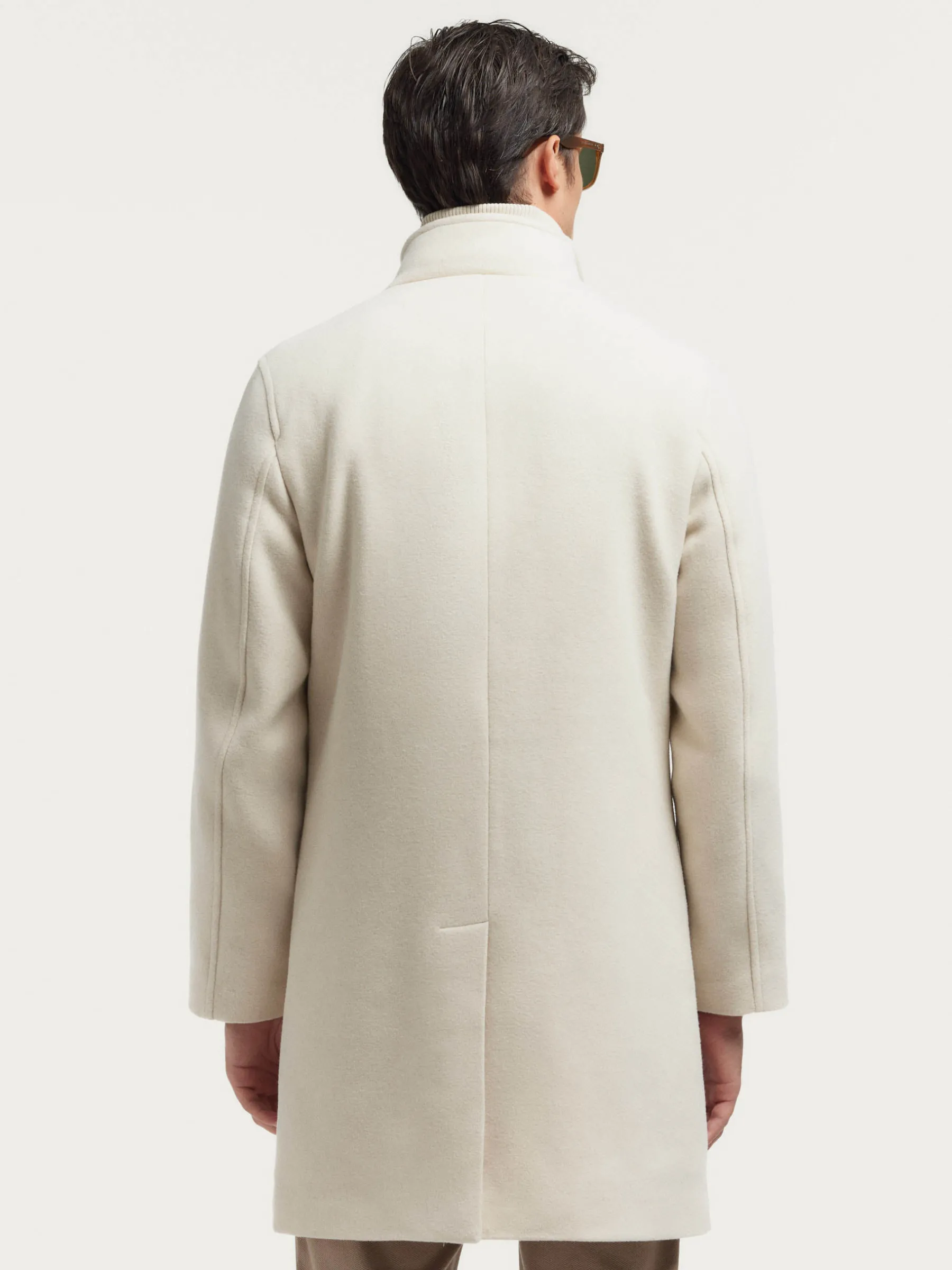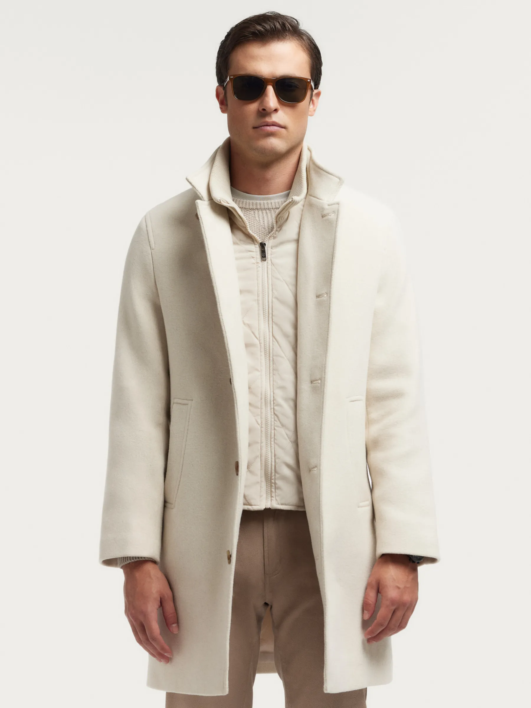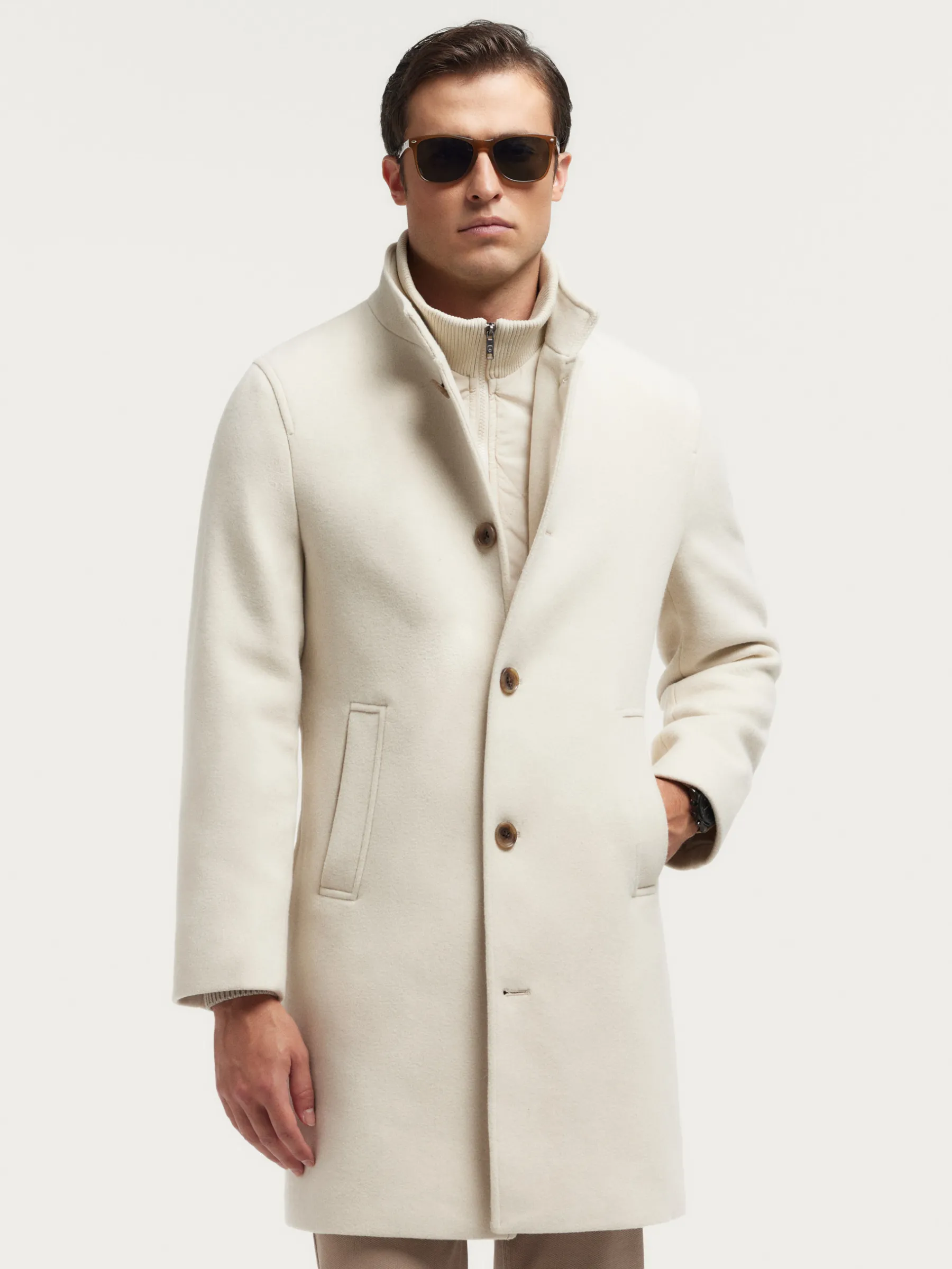 Abrigo con chalequillo interior de cuello subido y desmontable mediante cremallera. Cuenta con cuello y solapa, cierre central simple mediante botonadura efecto madera, cierre del chalequillo por cremallera y abertura en el bajo de la espalda. Dos bolsillos en la cintura y dos bolsillos en su interior. Corte regular fit.