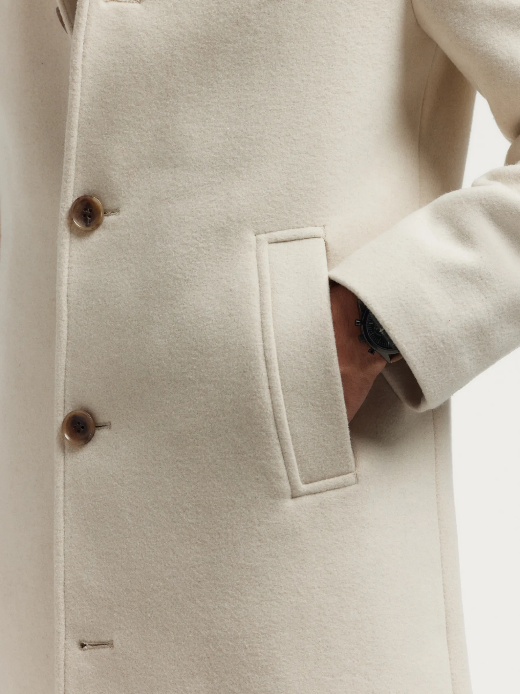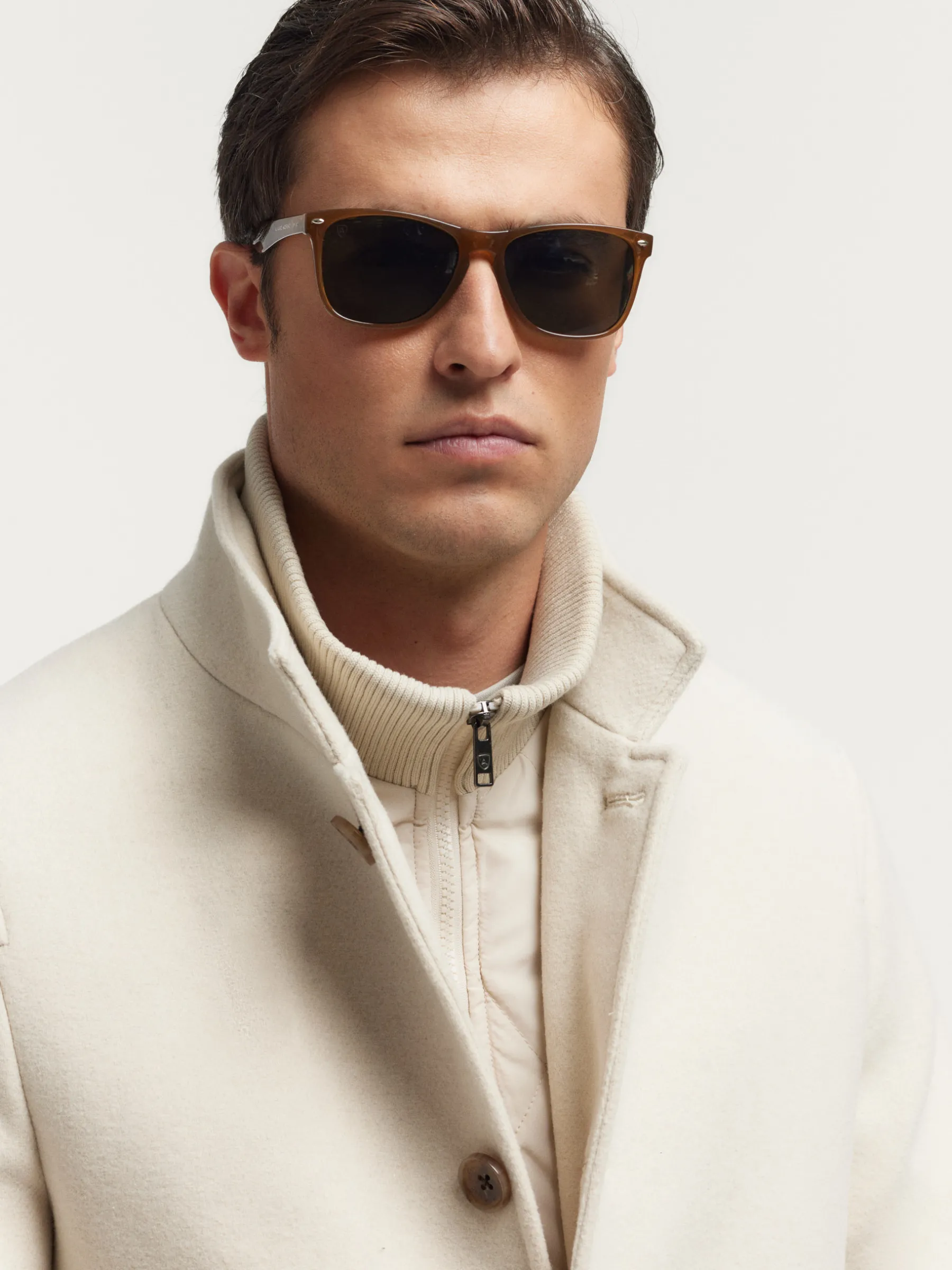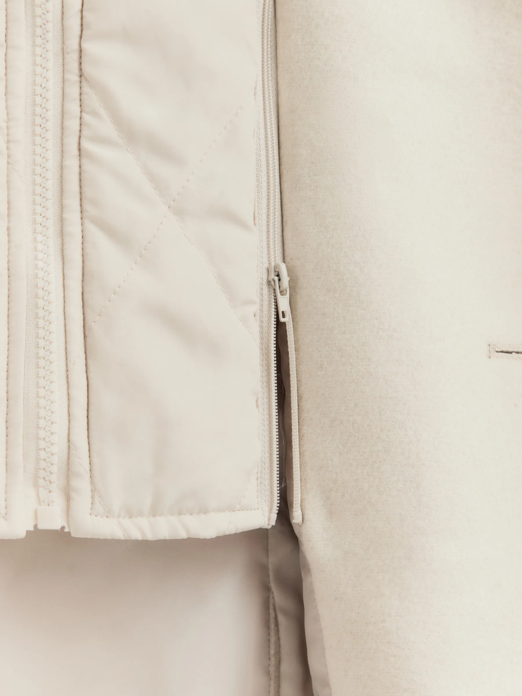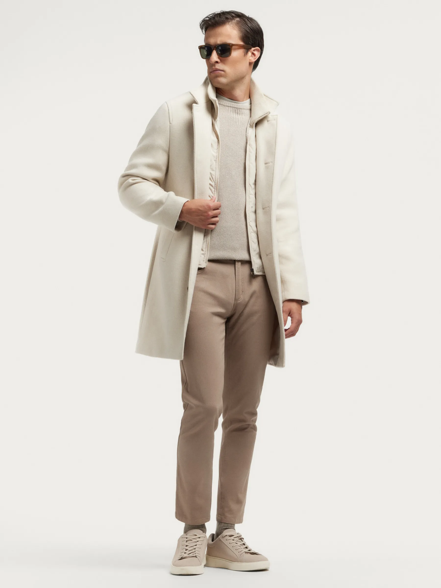 Abrigo con chalequillo interior de cuello subido y desmontable mediante cremallera. Cuenta con cuello y solapa, cierre central simple mediante botonadura efecto madera, cierre del chalequillo por cremallera y abertura en el bajo de la espalda. Dos bolsillos en la cintura y dos bolsillos en su interior. Corte regular fit.