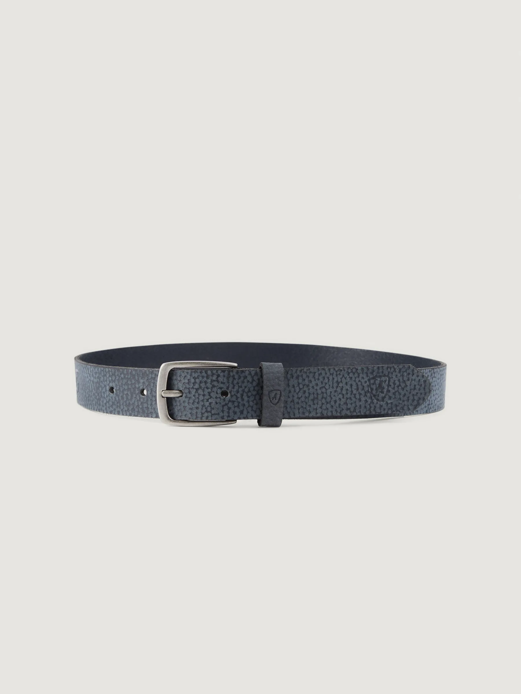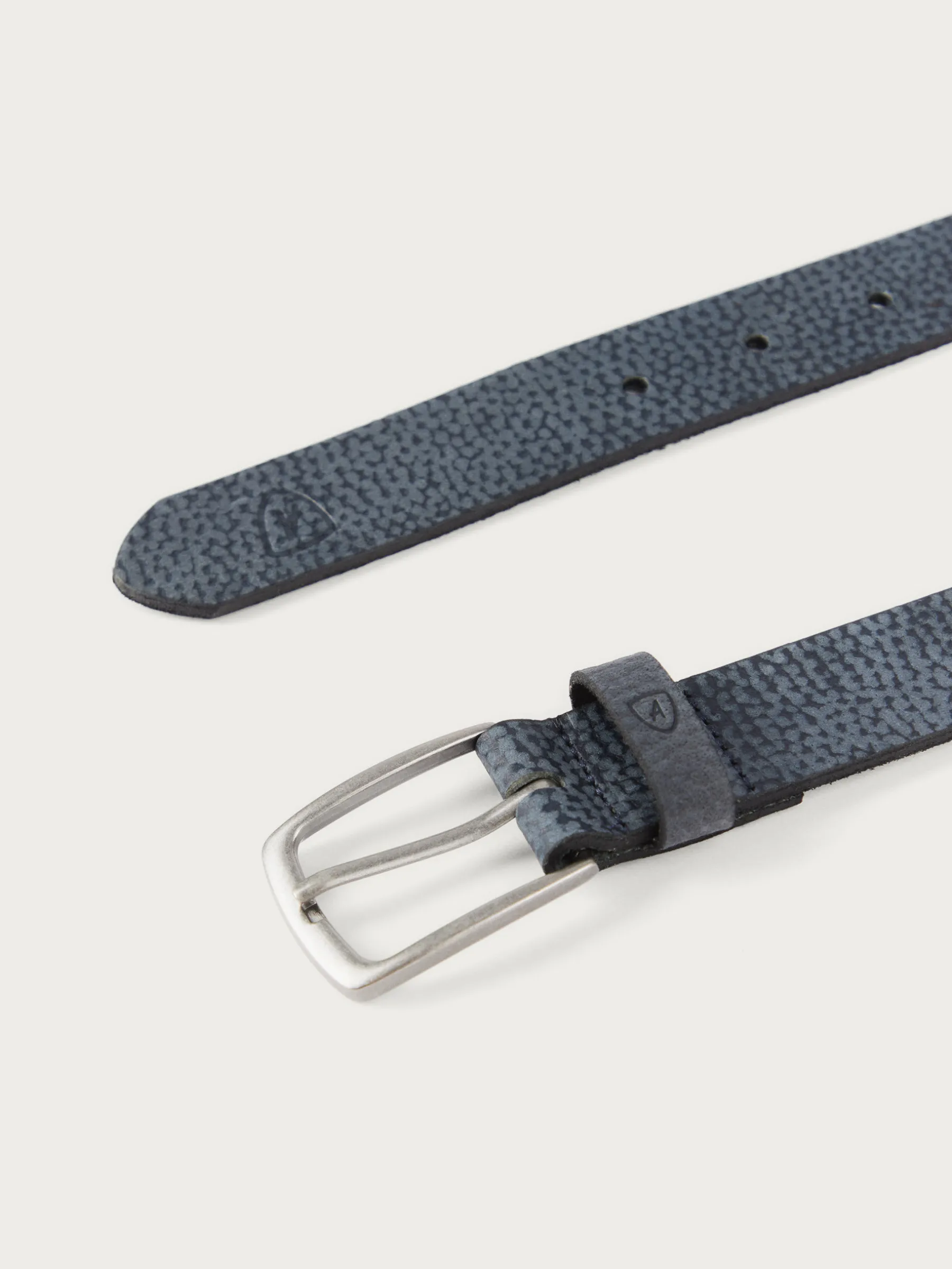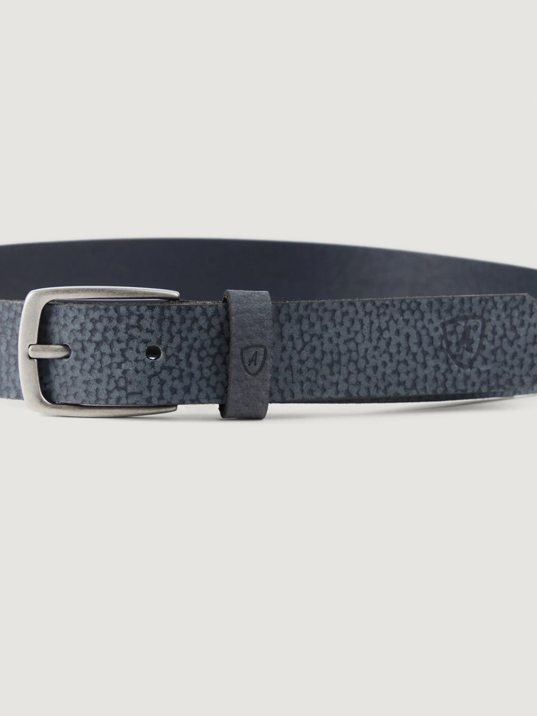 Cinturón confeccionado en piel con cierre central mediante hebilla metálica, pasador al tono y logo de la marca grabado al tono.