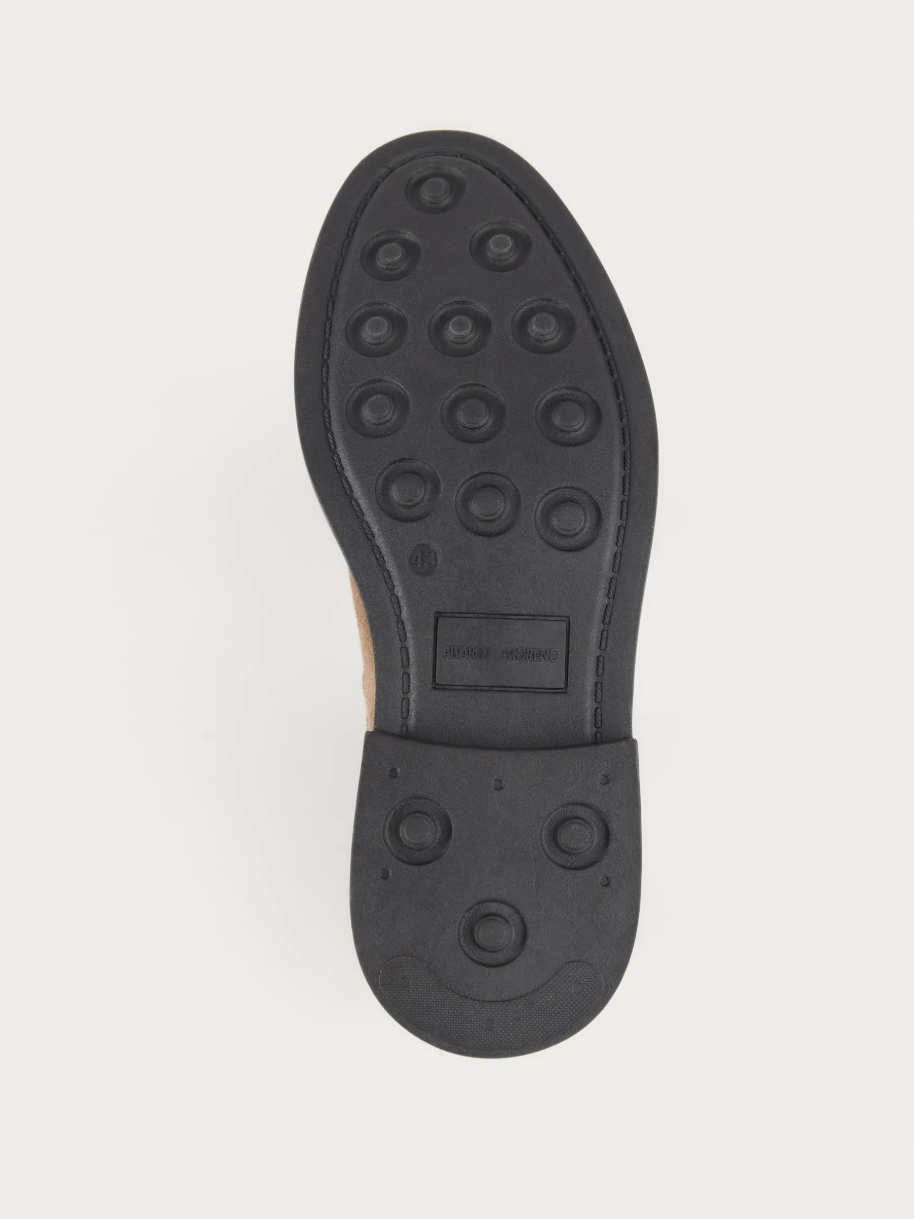Botín estilo chelsea de caña media confeccionado en acabado serraje. Cuenta con dos piezas elásticas laterales y tirador trasero.