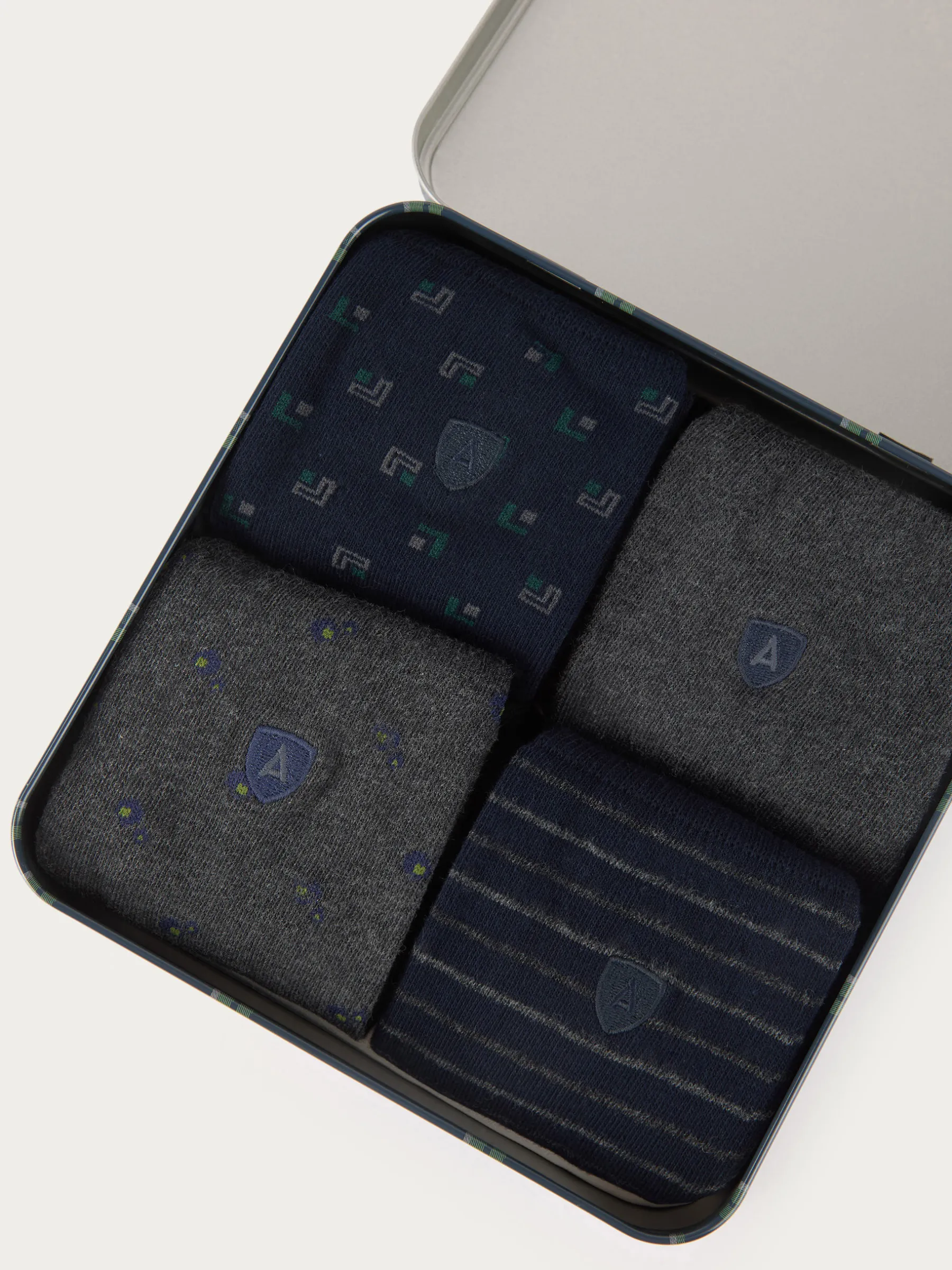 Pack de 4 calcetines de caña media confeccionados en algodón con diferentes diseños lisos, con líneas o detalles estampados. El complemento ideal para aportarnos personalidad en nuestros looks. ¡Elige tus favoritos!