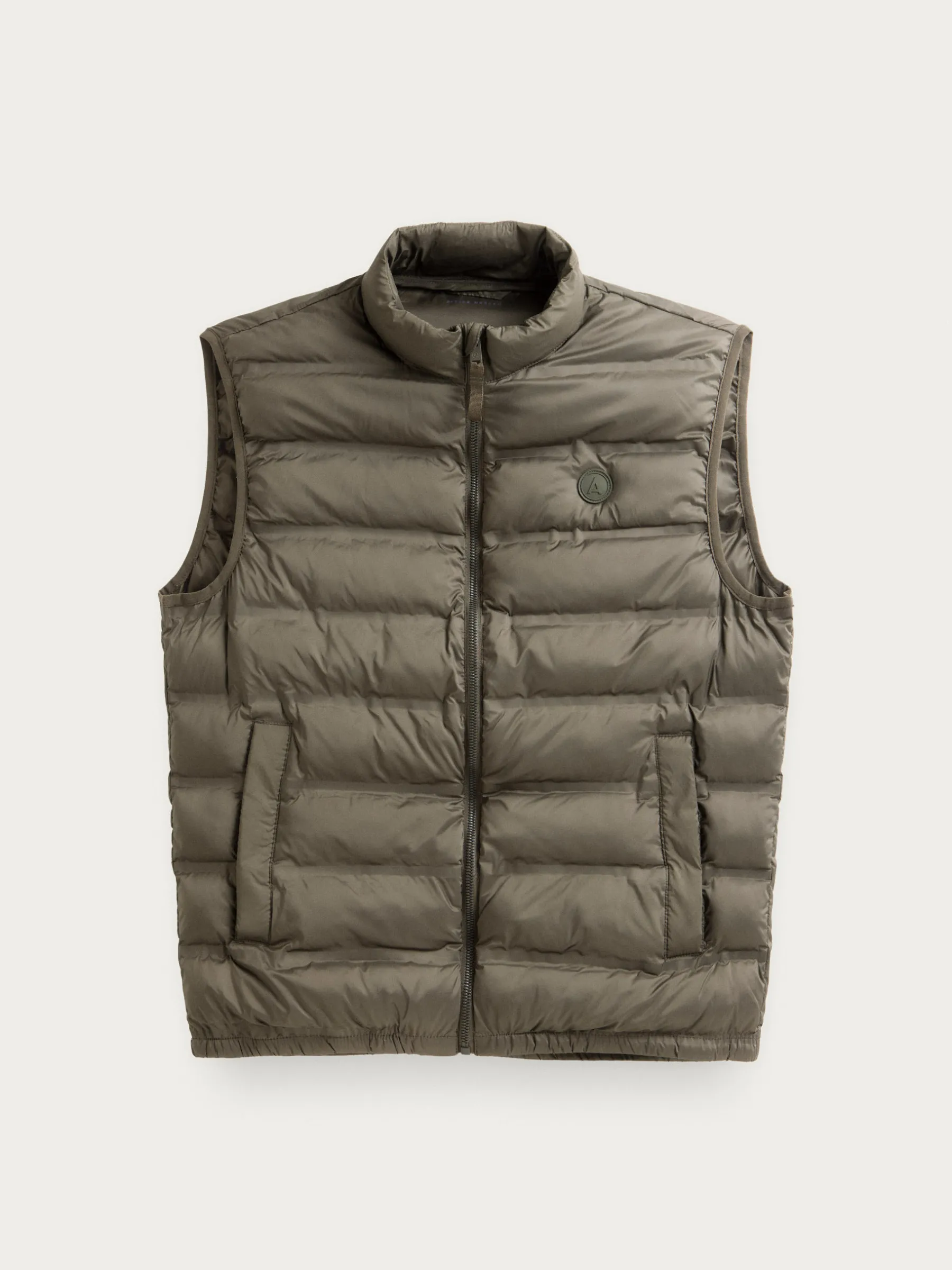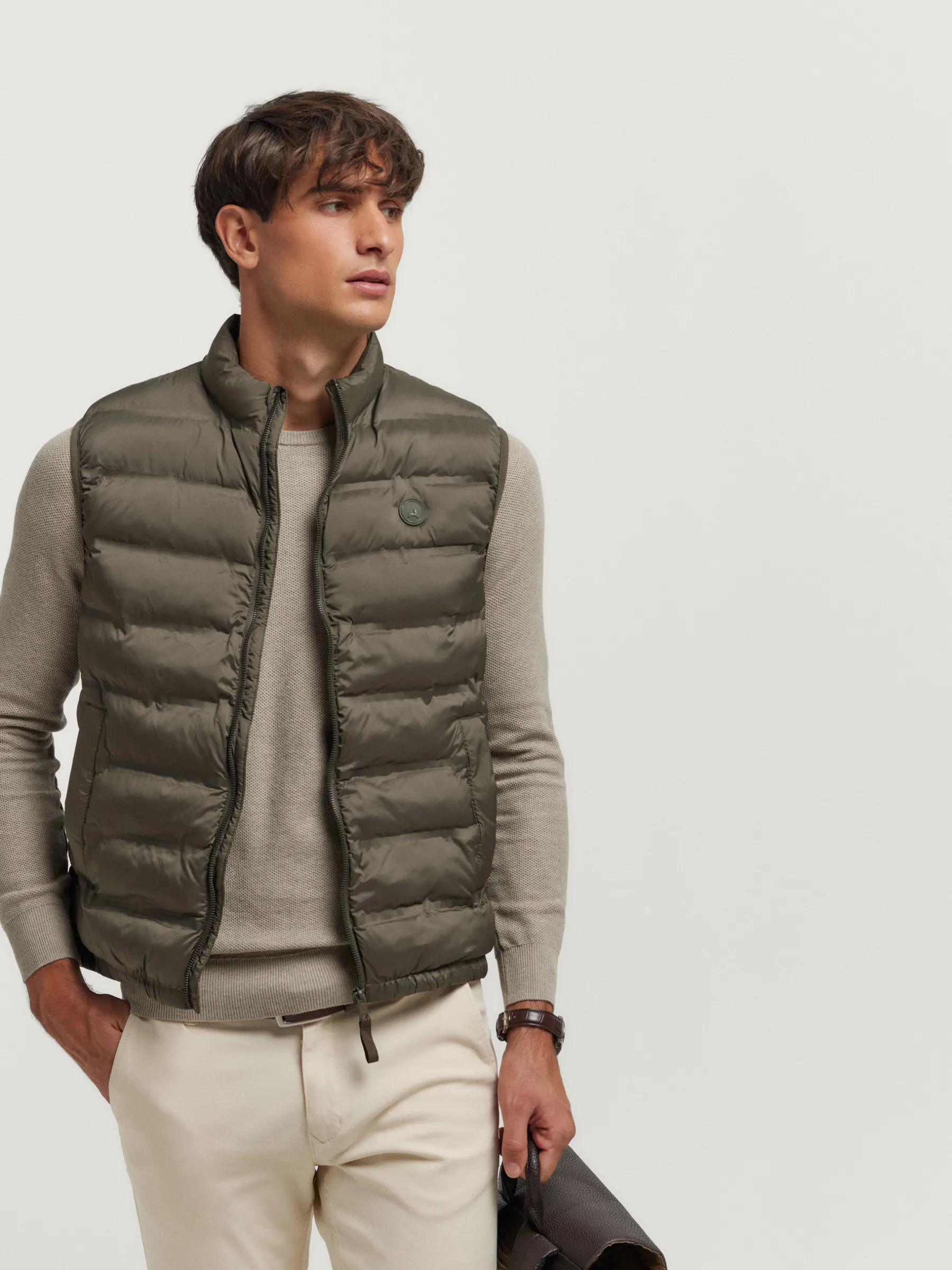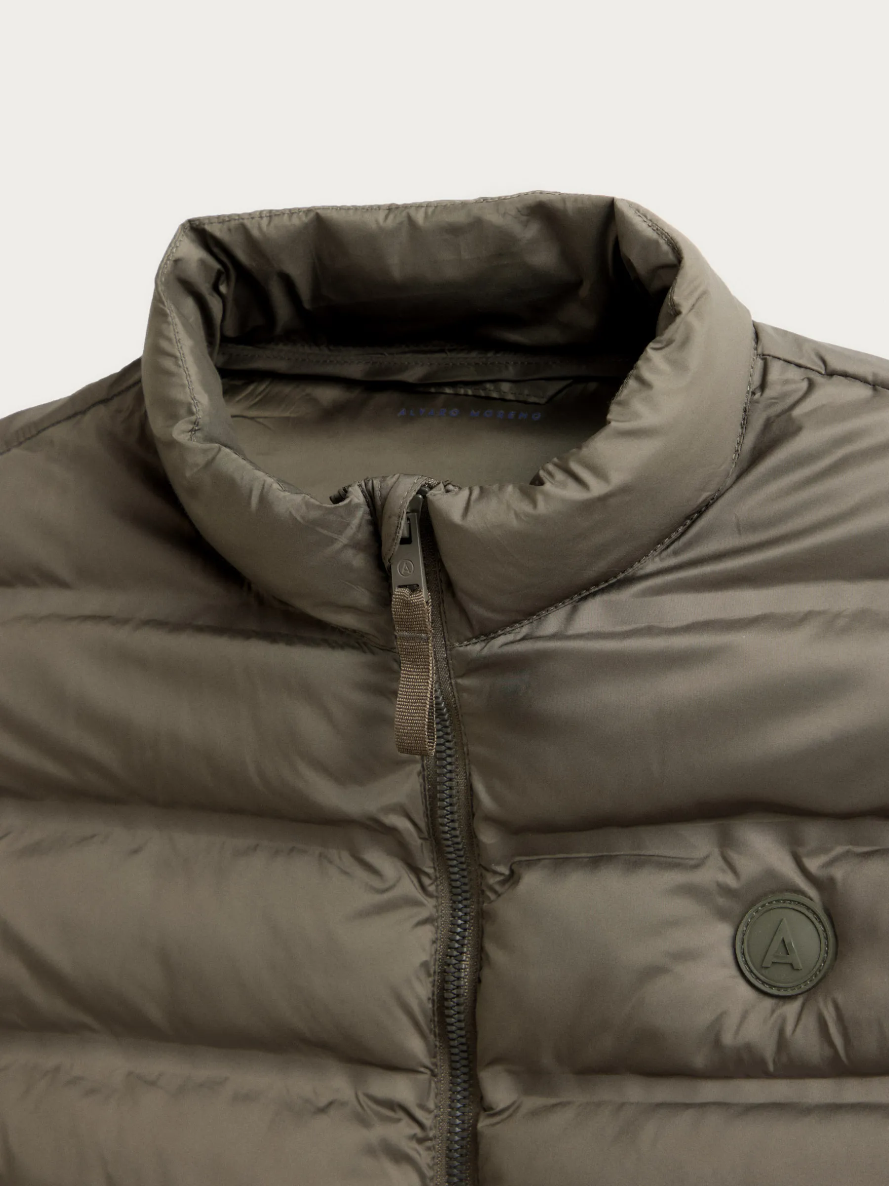 Chaleco acolchado con cuello subido y cierre central mediante cremallera, dos bolsillos a la altura de la cintura y logo de la marca grabado en el pecho al tono. Elástico en la sisa y cintura. Forro interior a contraste con bolsillos.