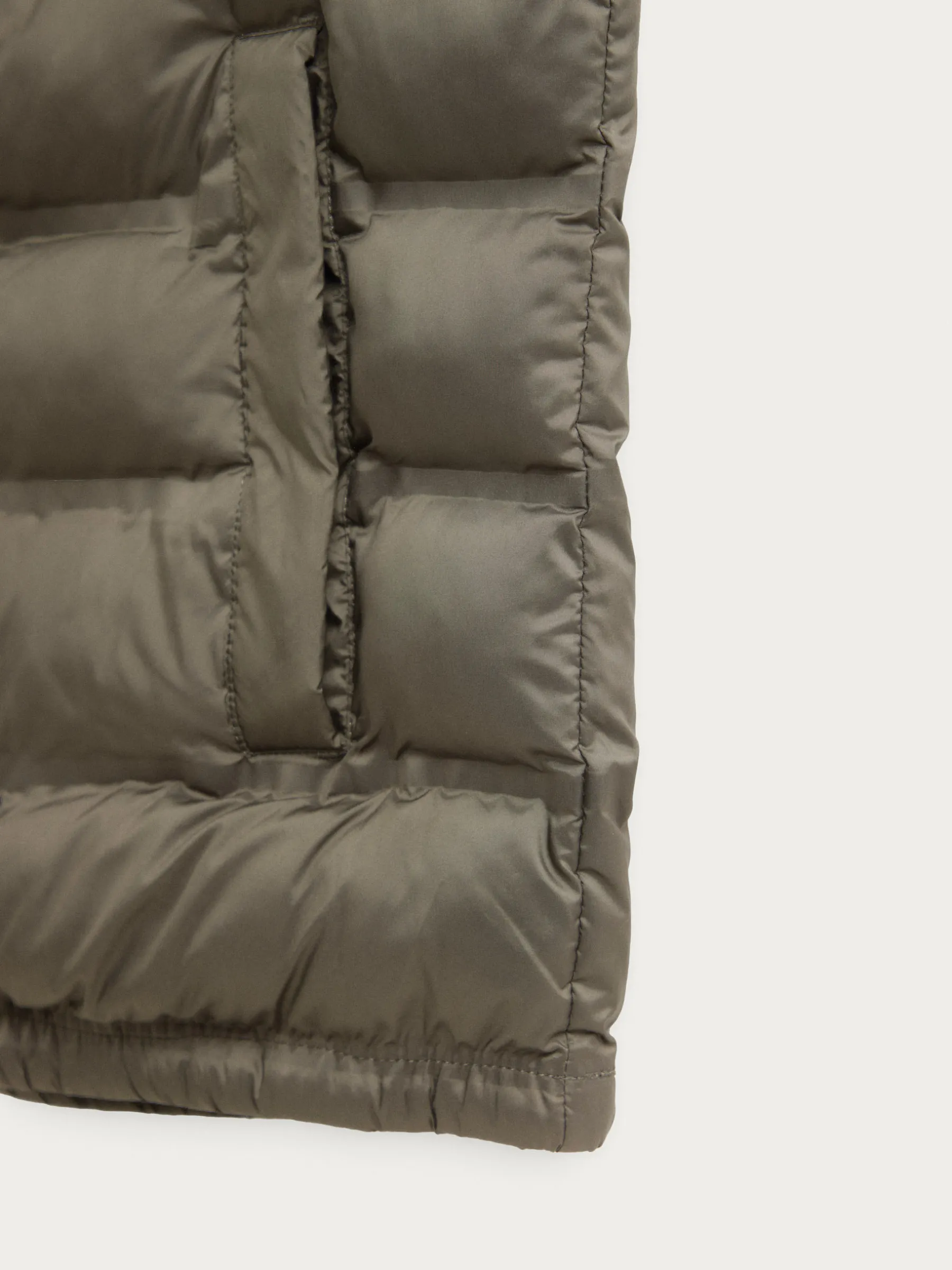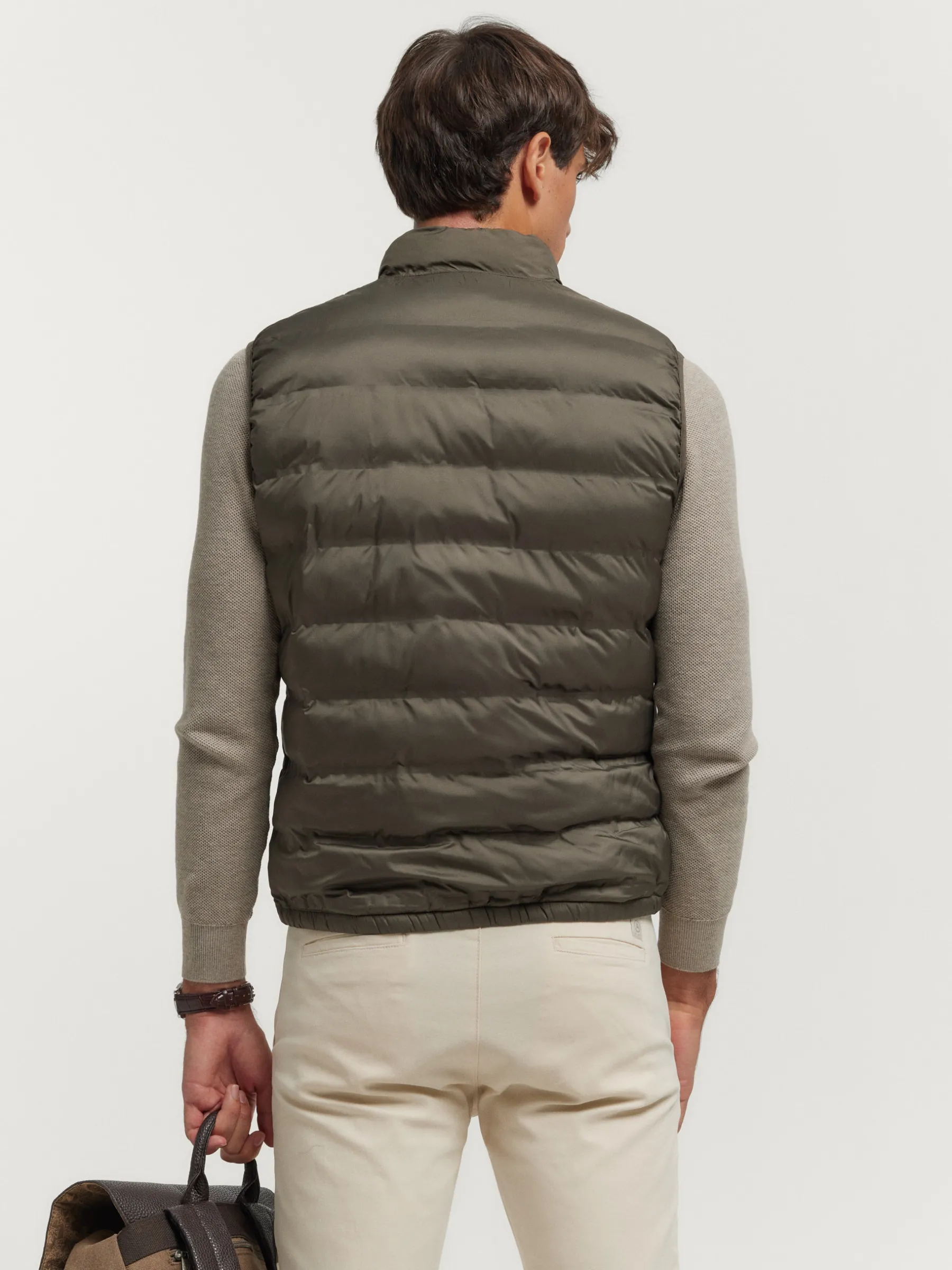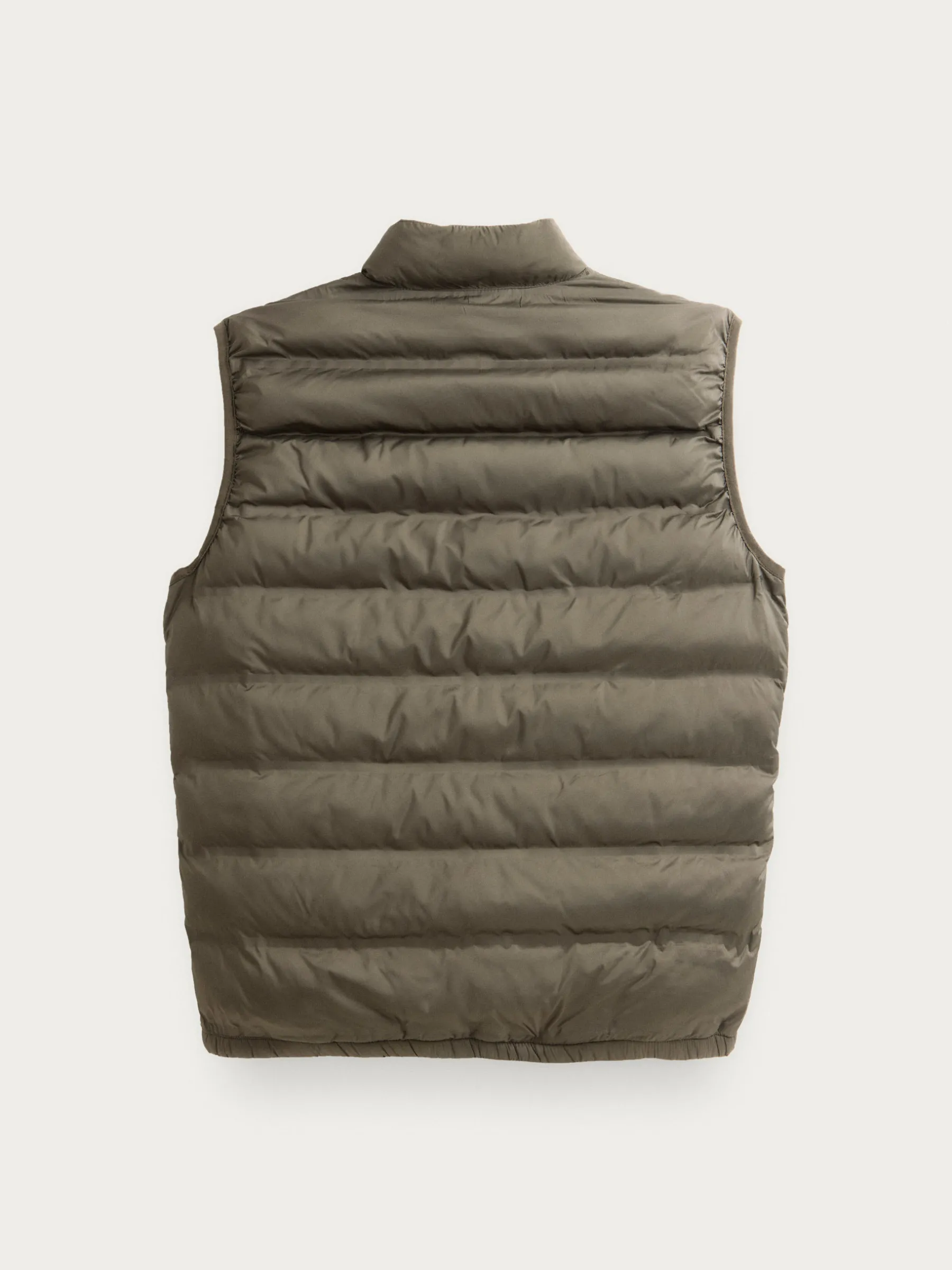 Chaleco acolchado con cuello subido y cierre central mediante cremallera, dos bolsillos a la altura de la cintura y logo de la marca grabado en el pecho al tono. Elástico en la sisa y cintura. Forro interior a contraste con bolsillos.