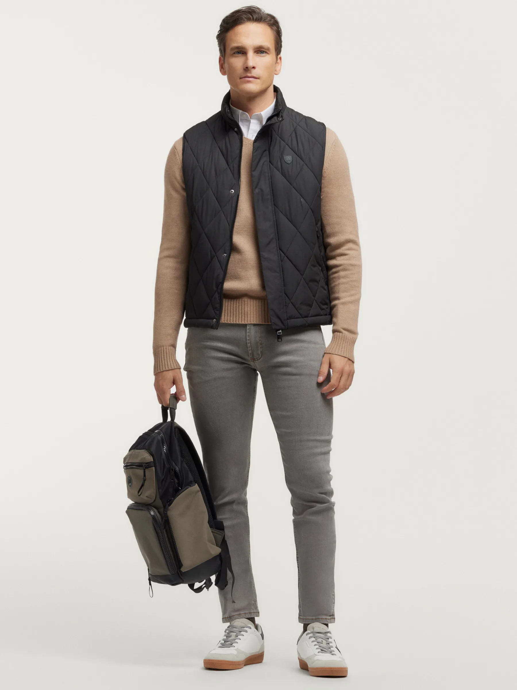 Chaleco con cuello alto y tejido en forma de rombos. Cuenta con cierre central mediante doble cremallera oculta por tapeta de botones a presión, logo de la marca grabado al tono en el frontal y dos bolsillos a la altura de la cintura. Corte regular fit.