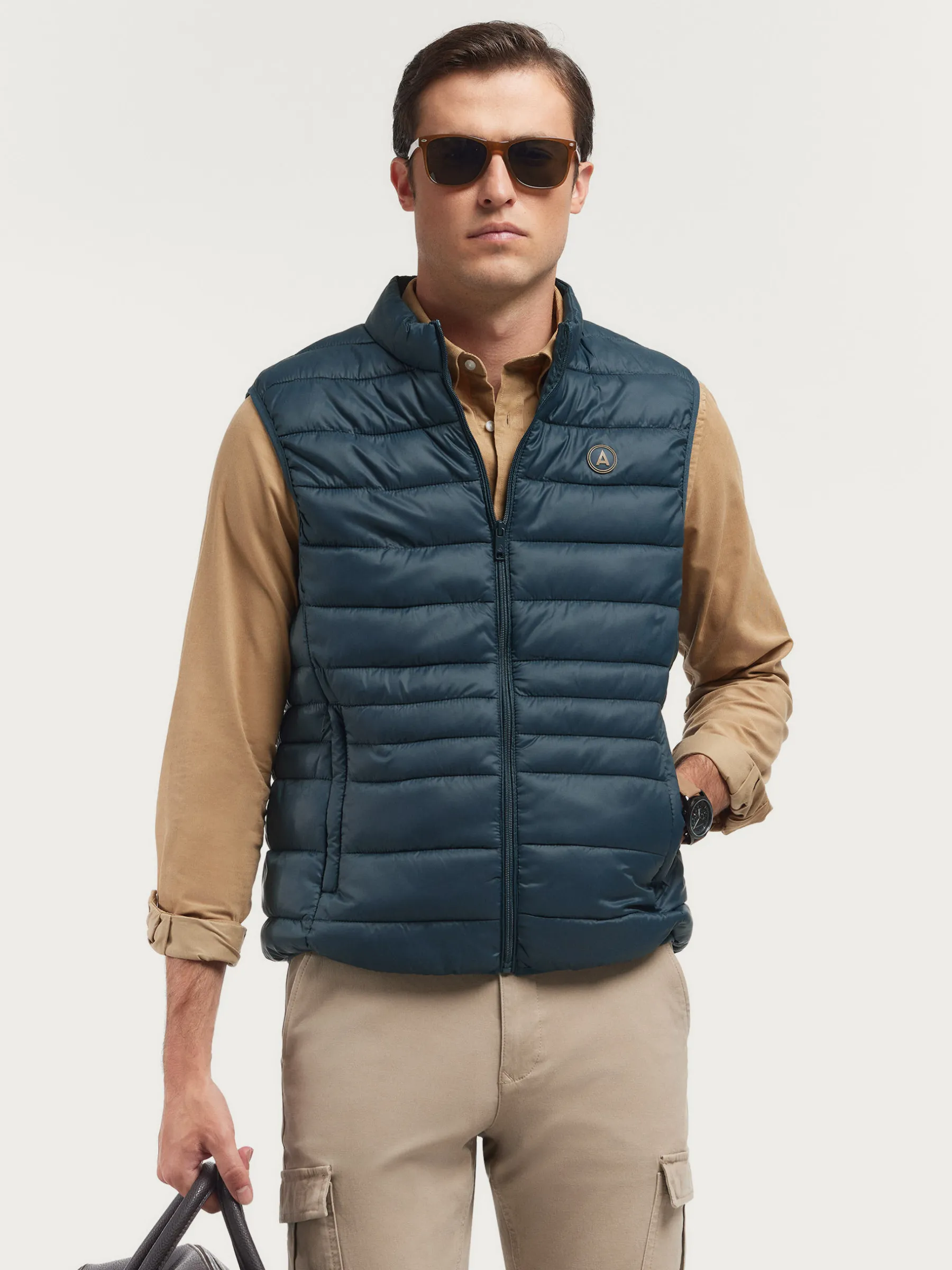 Chaleco acolchado con cuello subido. Dos bolsillo a la altura de la cintura, logo grabado en el frontal y sisa y cintura en punto elástico. Forro interior a contraste con bolsillos.