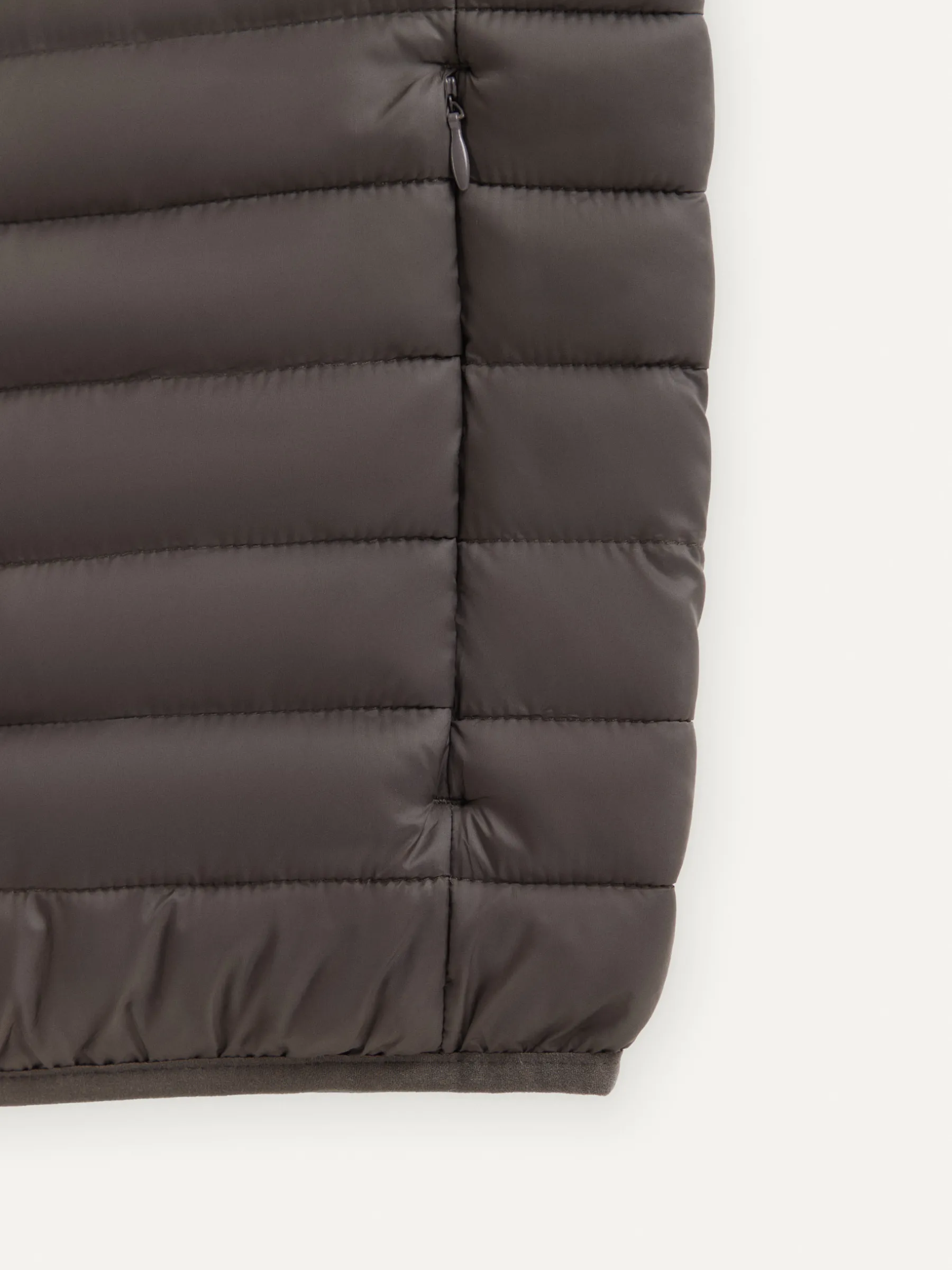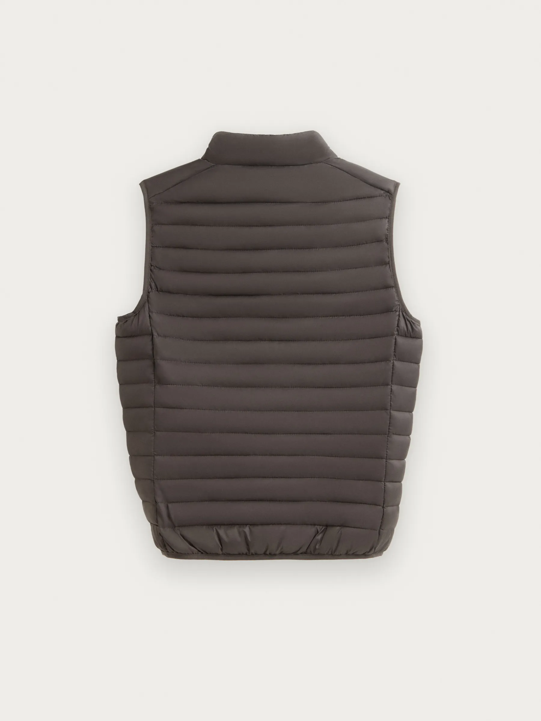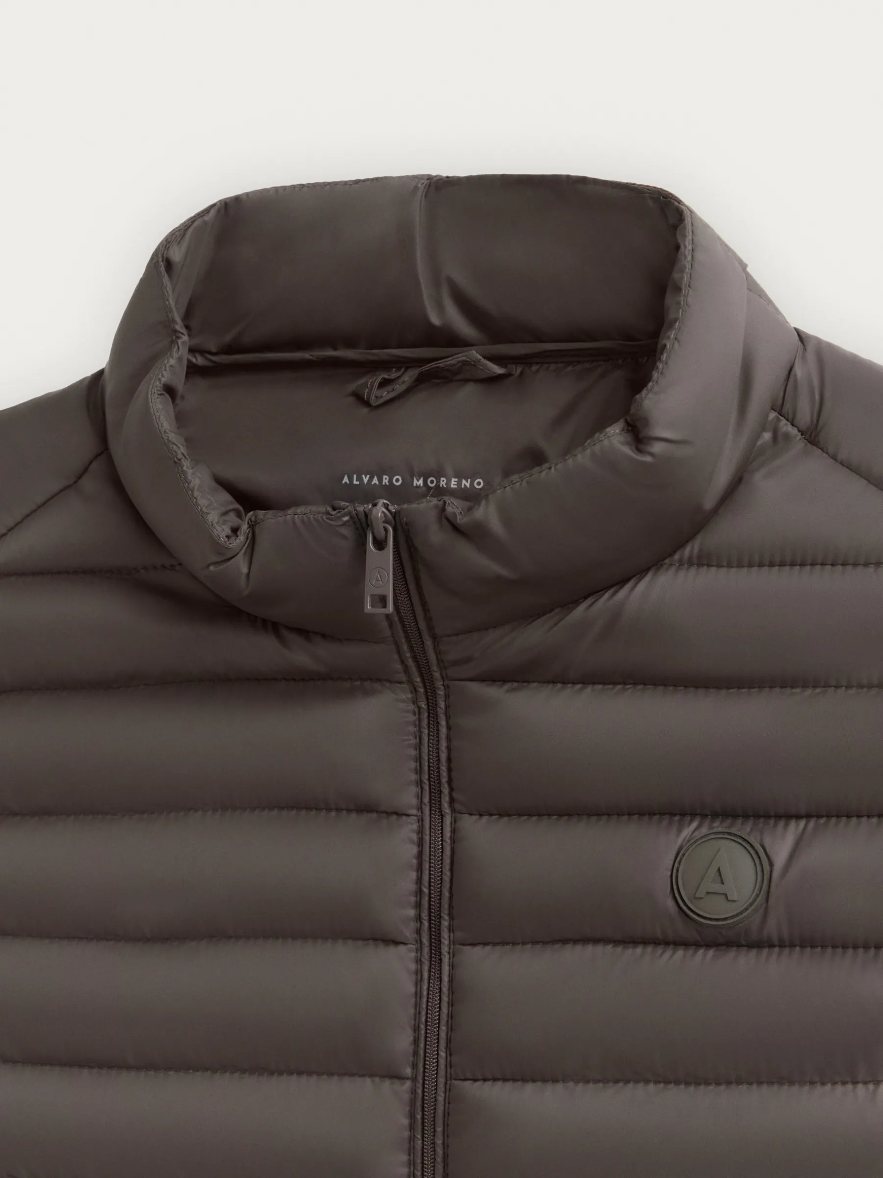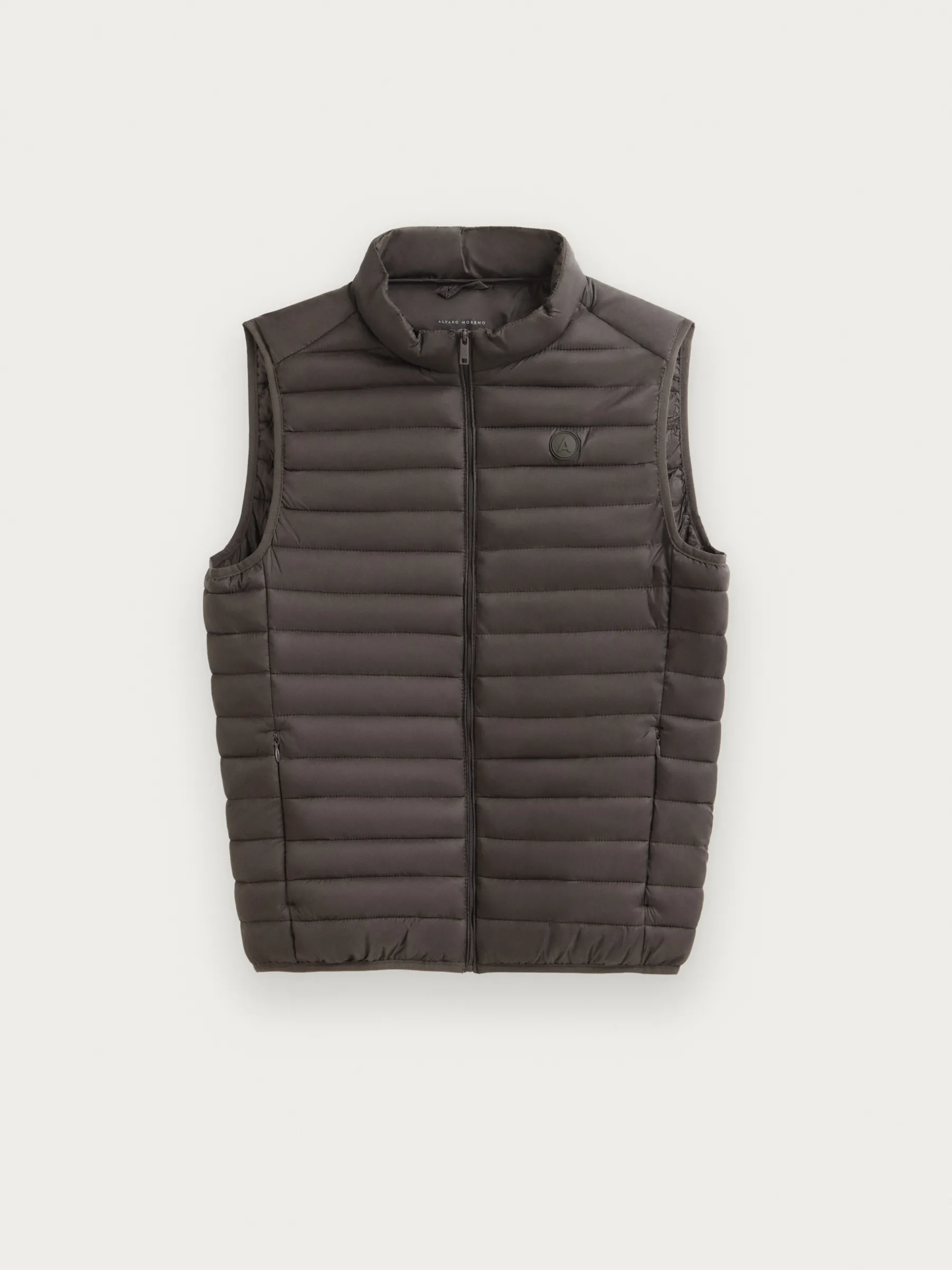 Chaleco acolchado con cuello subido y cierre central mediante cremallera, dos bolsillos a la altura de la cintura y logo de la marca grabado en el pecho. Elástico en la sisa y cintura. Forro interior a contraste con bolsillos.