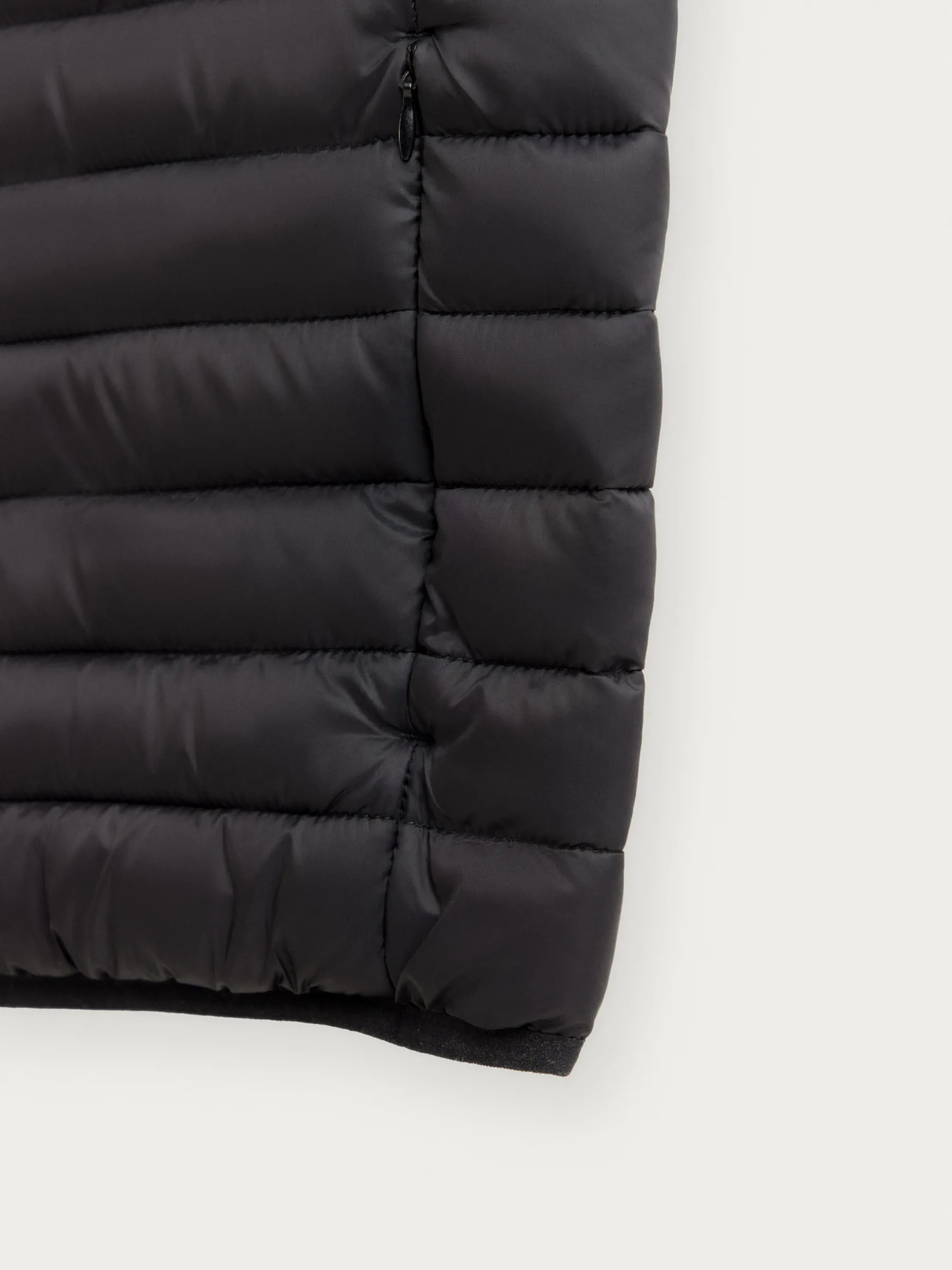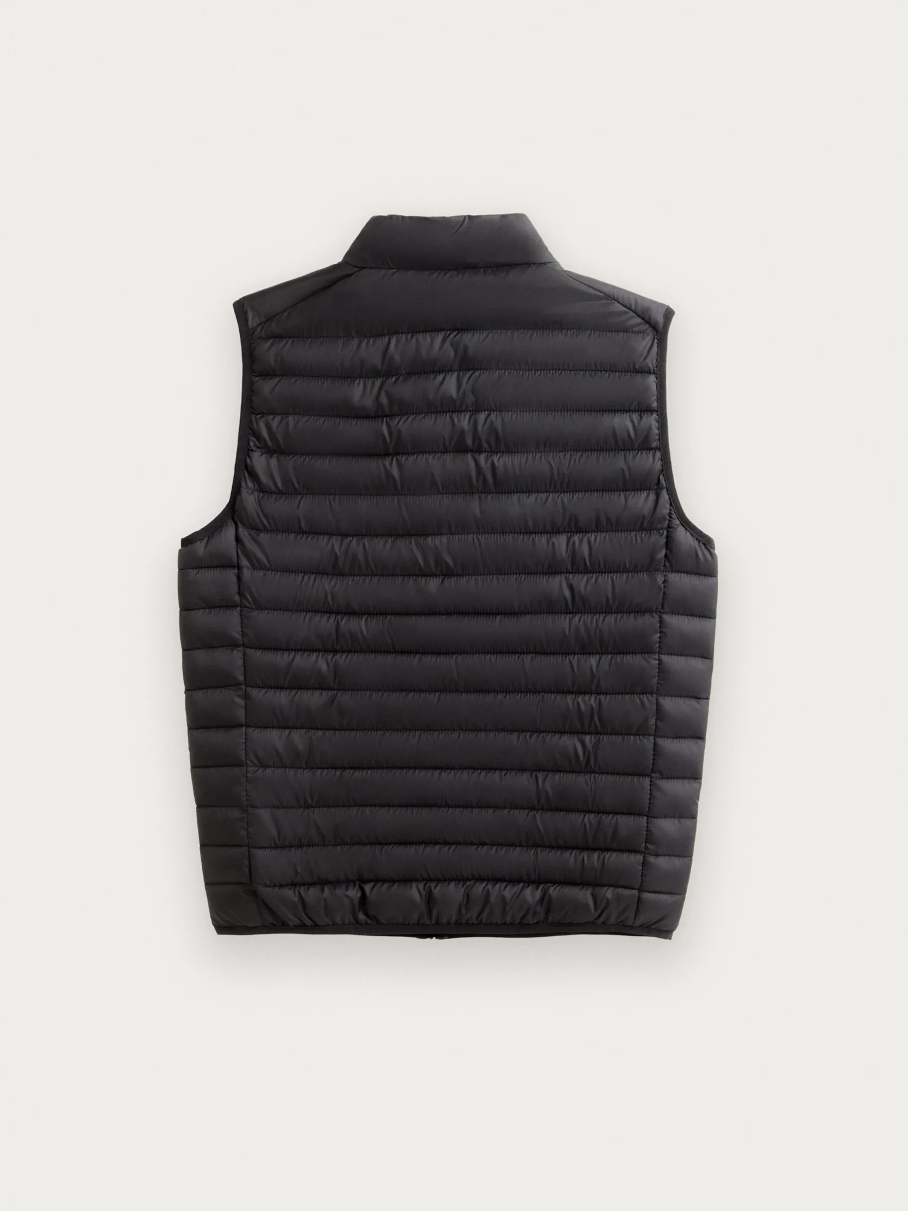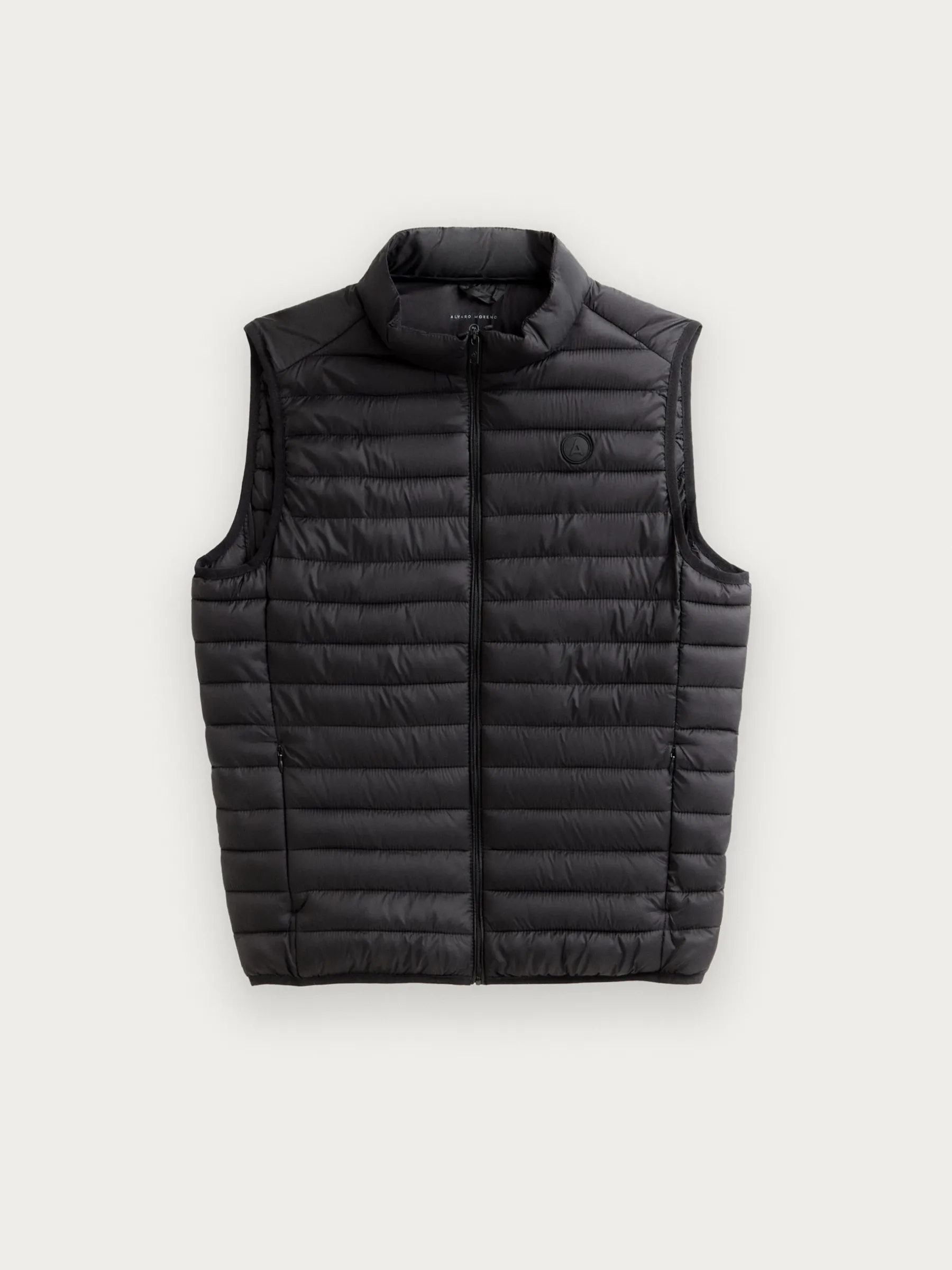 Chaleco acolchado con cuello subido y cierre central mediante cremallera, dos bolsillos a la altura de la cintura y logo de la marca grabado en el pecho. Elástico en la sisa y cintura. Forro interior a contraste con bolsillos.