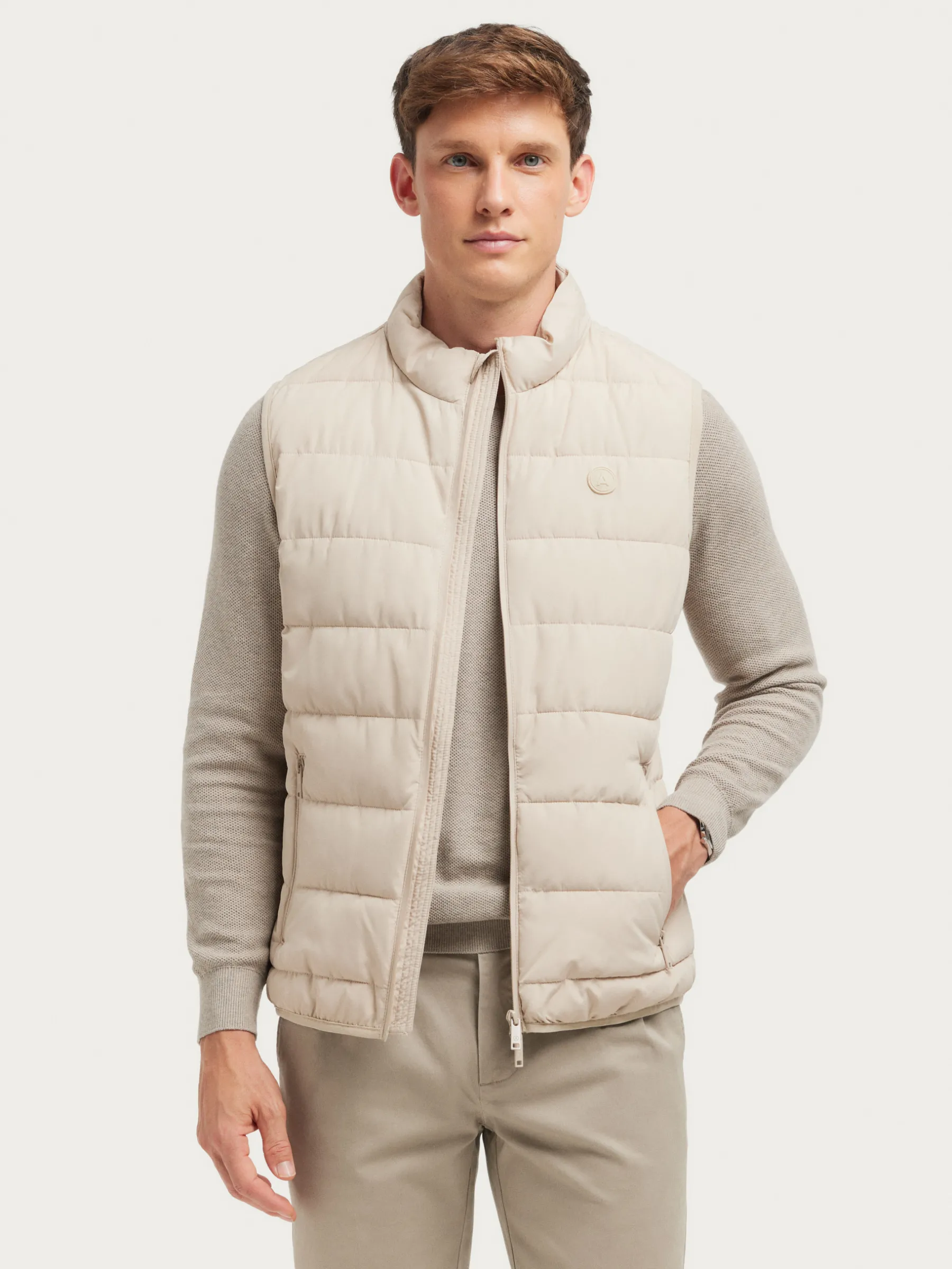 Chaleco acolchado con cuello subido y cierre central mediante doble cremallera, dos bolsillos a la altura de la cintura con cierre de cremallera y logo de la marca grabado en el frontal al tono. Elástico en la sisa y cintura. Cremalleras termoselladas. Interior con dos bolsillos y doble compartimento cada uno.