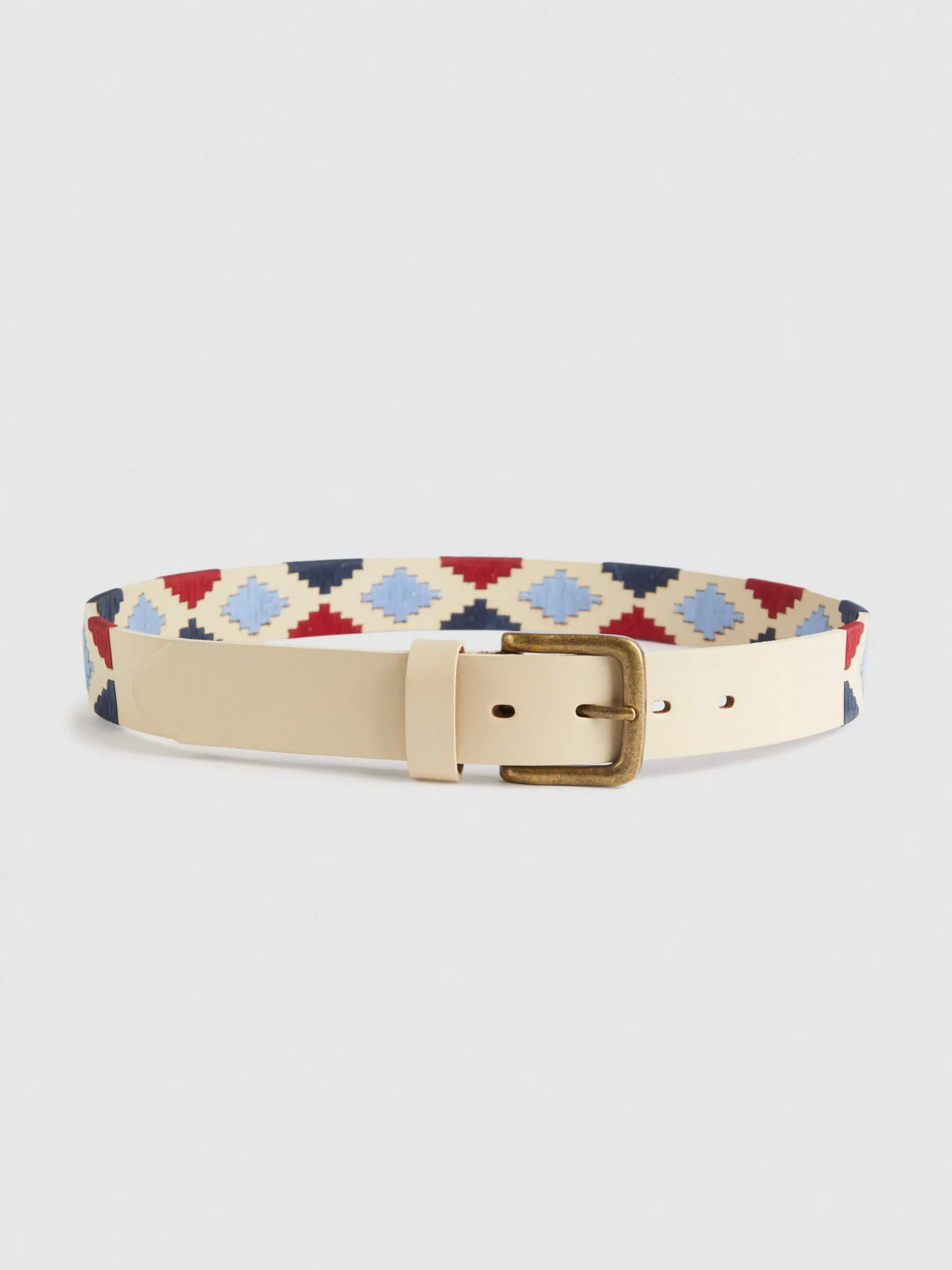 Cinturón con detalles personalizados y cierre central mediante hebilla metálica y pasador.
