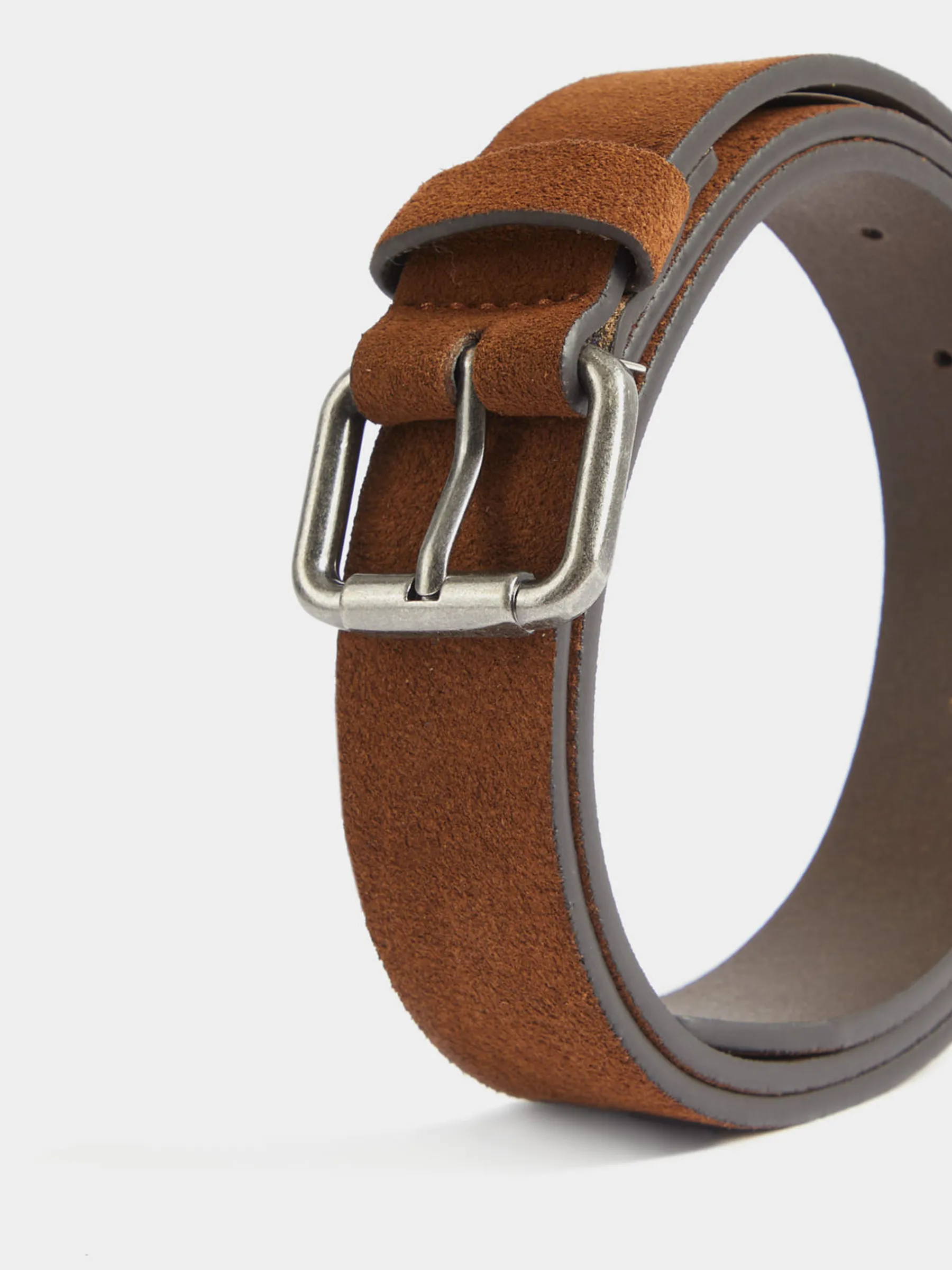Cinturón listo estilo casual confeccionado en serraje con cierre mediante hebilla metálica a contraste y pasador al tono. Detalles y pespuntes al tono.