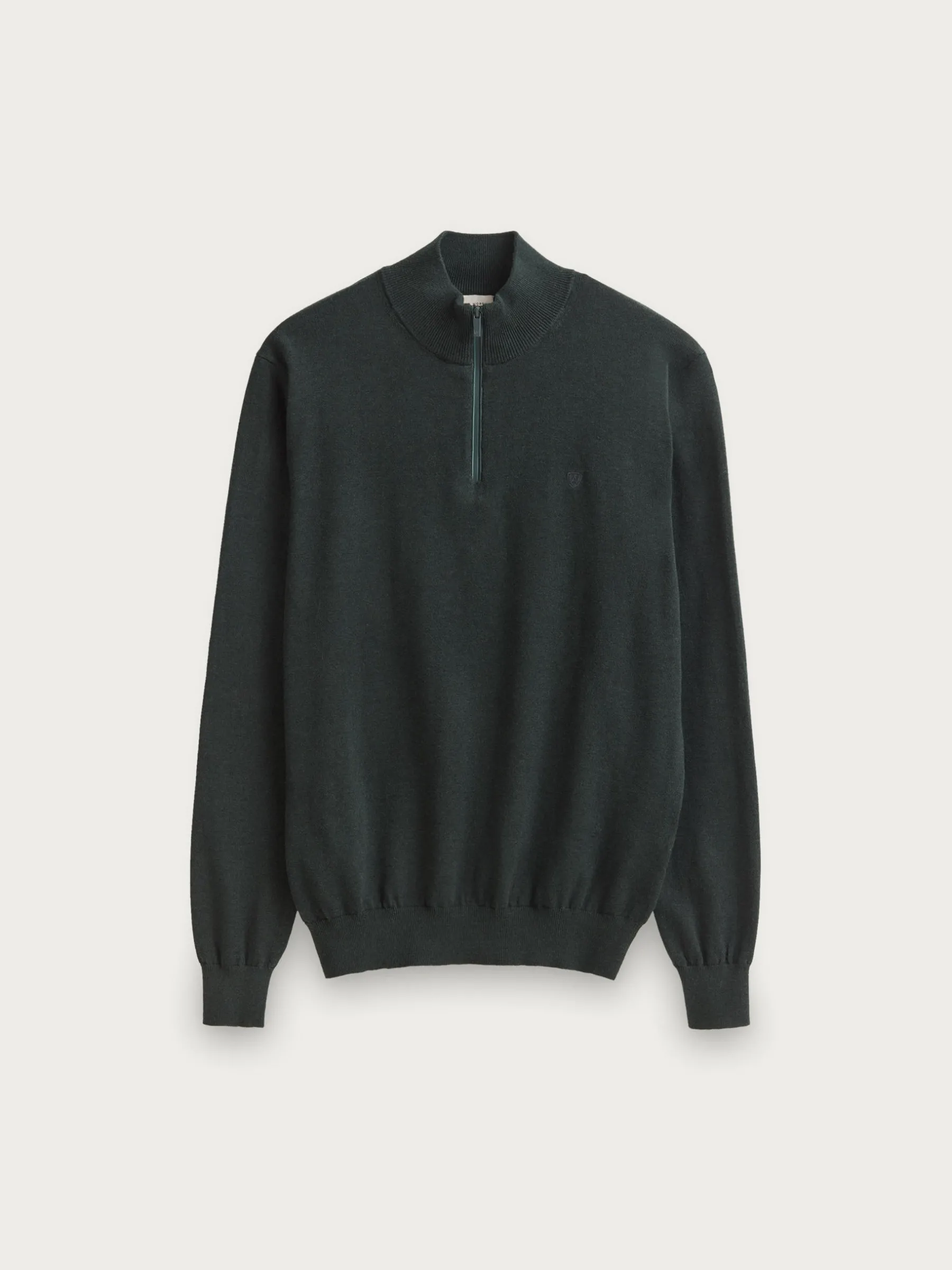 Jersey de corte regular confeccionado en algodón. Cuello alto con medio cierre de cremallera. Logo bordado en el frontal al tono. Cuello, puños y bajo en acabado elástico.