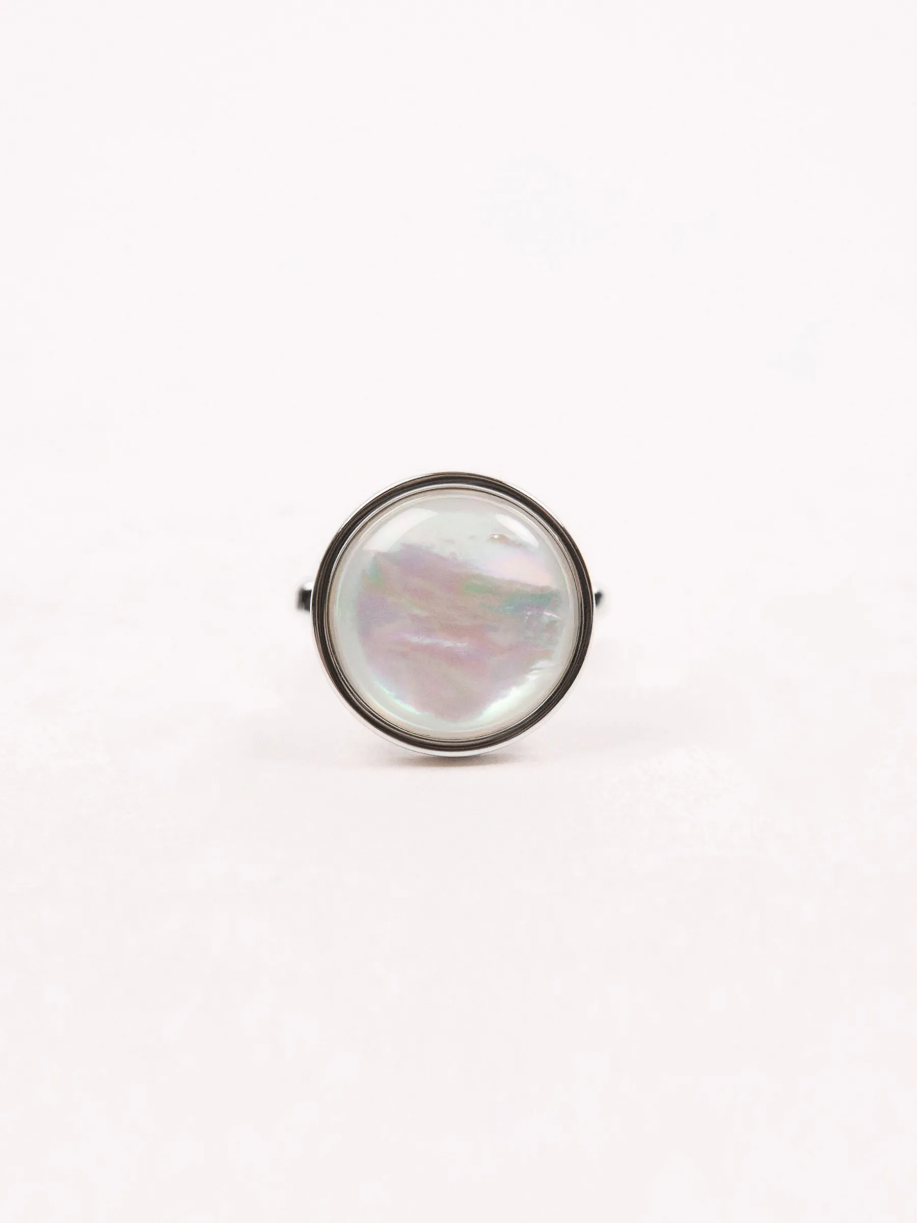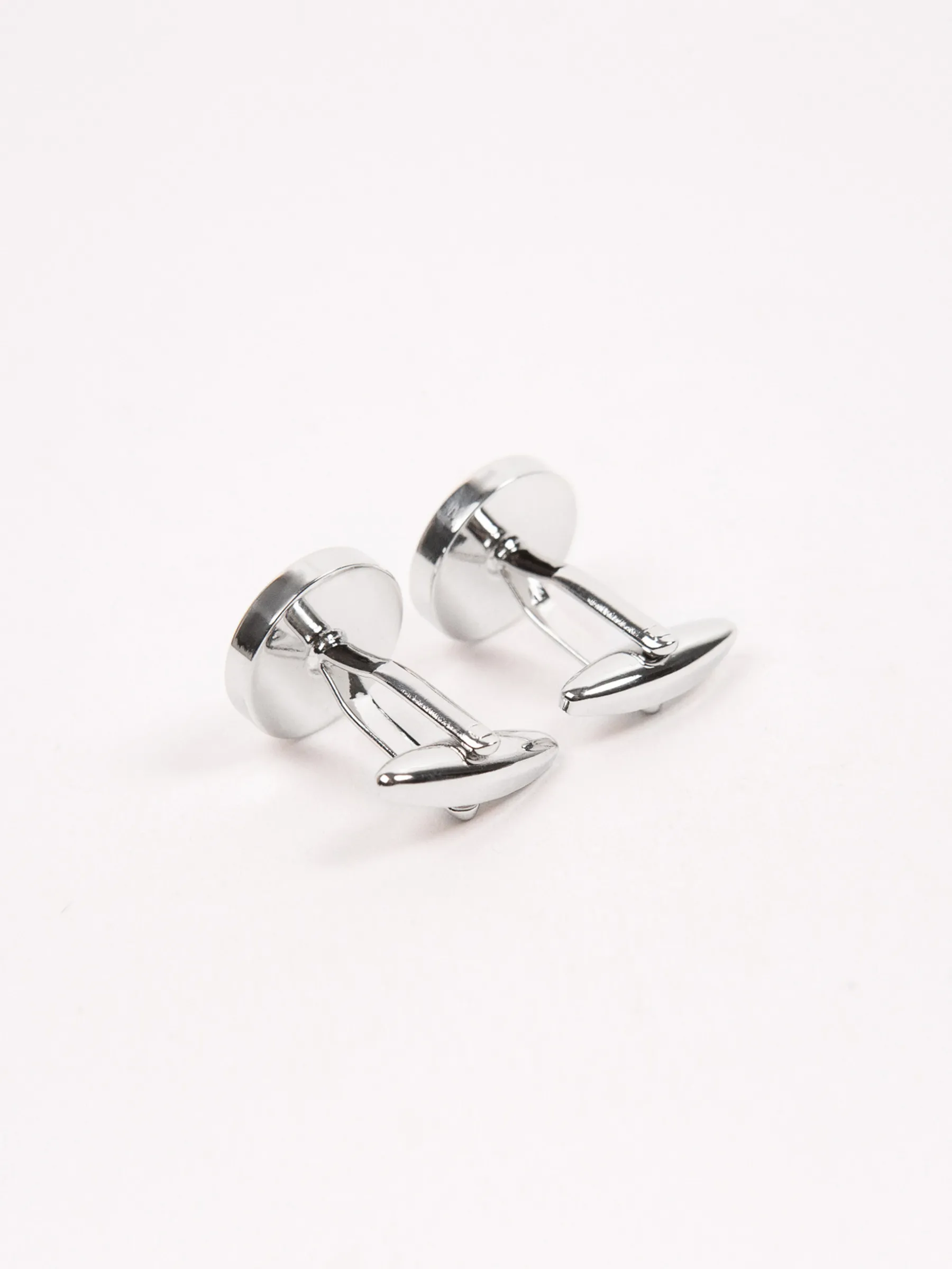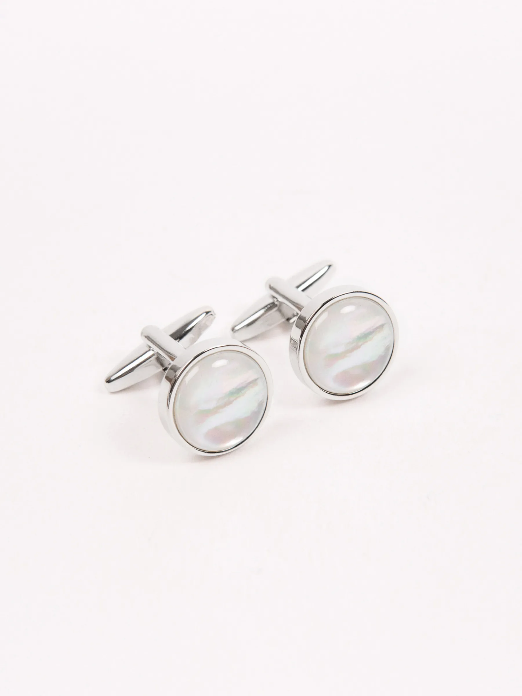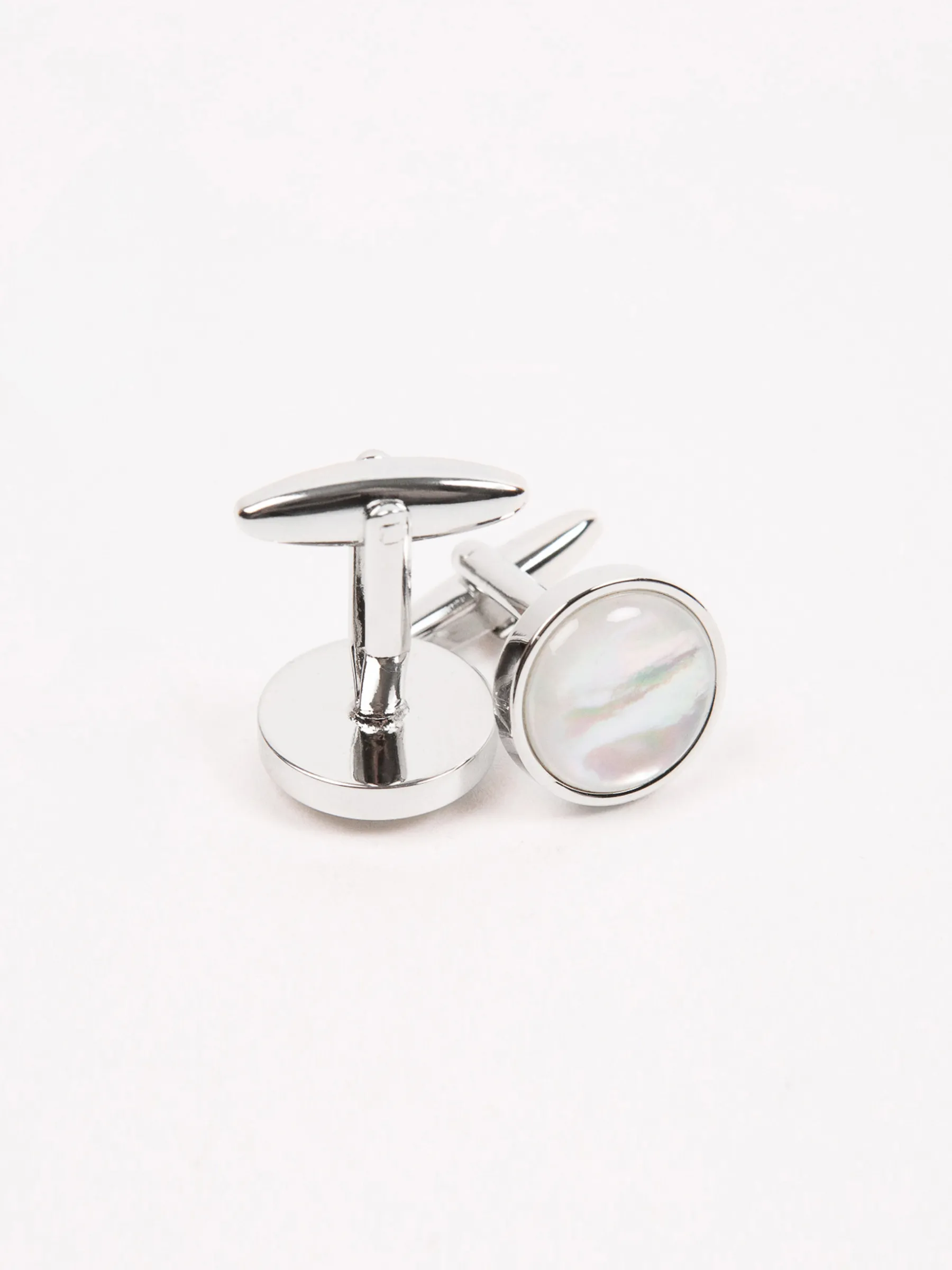 Gemelo metálico de forma redonda que cuenta con engarce de piedra natural azul.