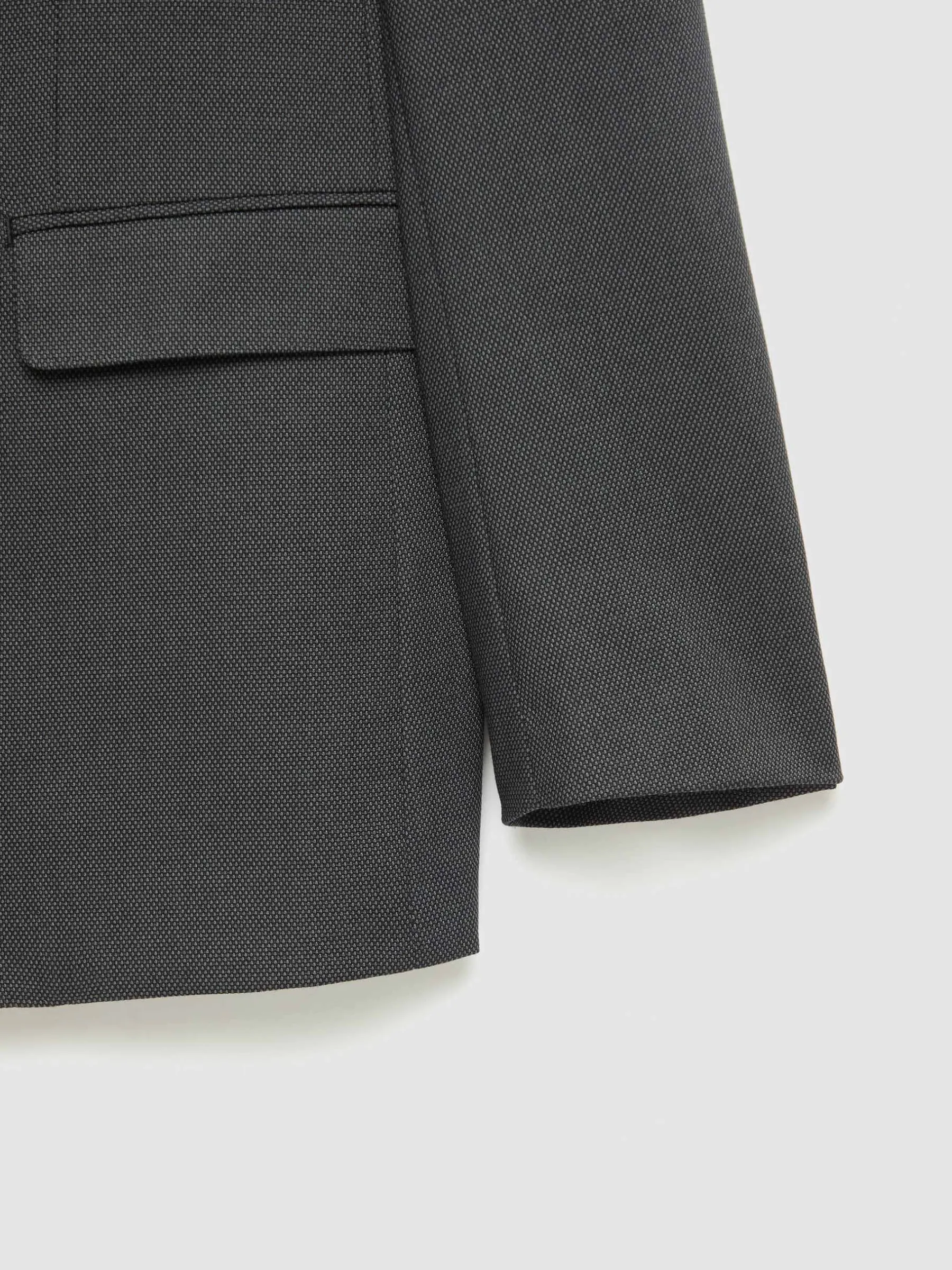 Americana con cuello y solapa en tejido de ojo de perdiz. Cierre central mediante botones, bolsillo de ojal en el pecho, tres bolsillos de solapa en la cintura y puños con botones decorativos. Interior forrado y con bolsillos.