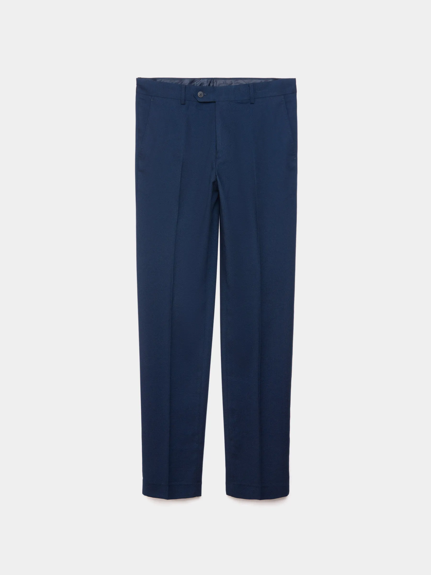 Pantalón de traje en tejido de ojo de perdiz que cuenta con cierre frontal de cremallera y botones, dos bolsillos abiertos en la parte delantera y dos bolsillos traseros con cierre mediante botón. Forrado en su interior.
