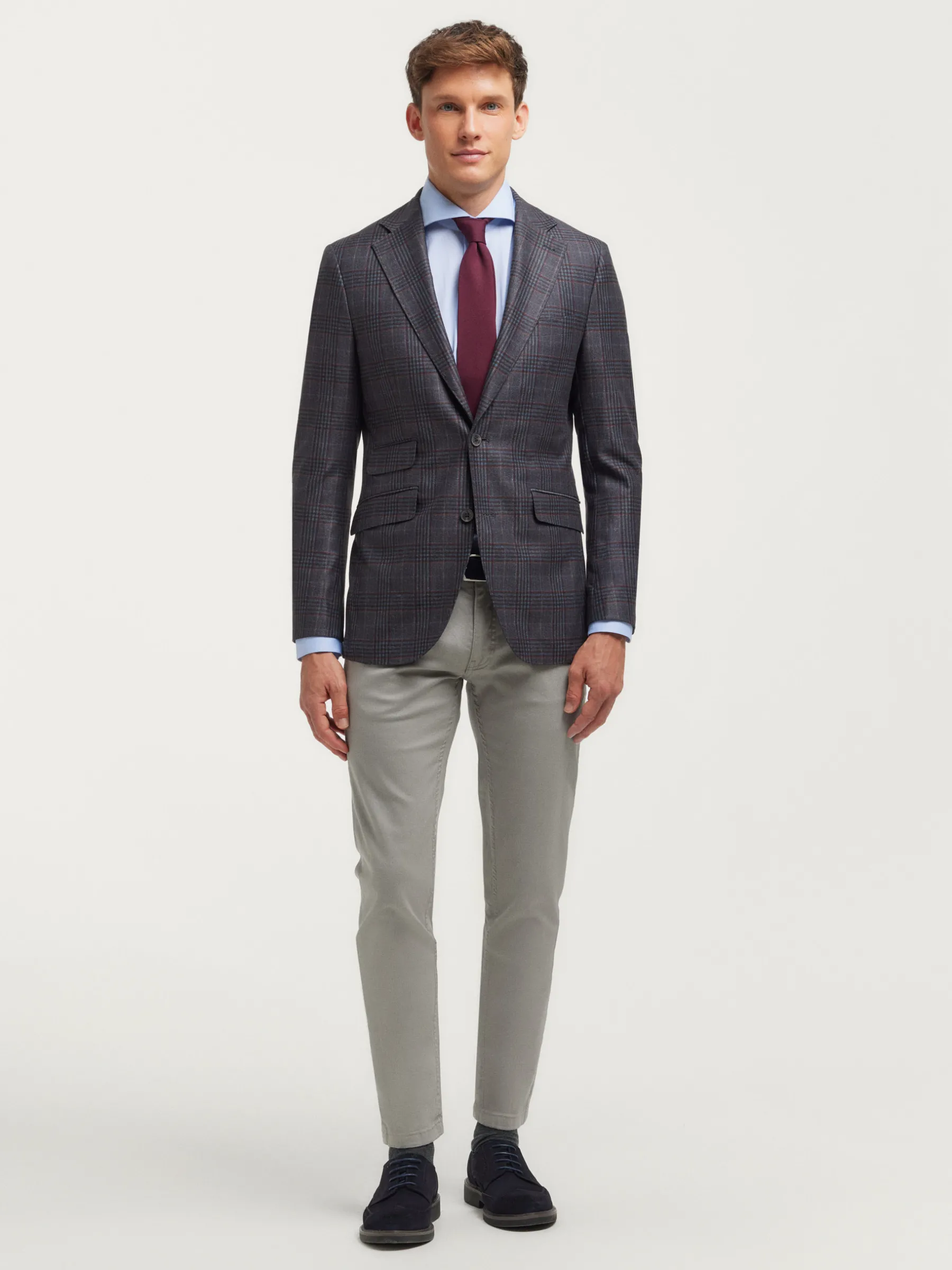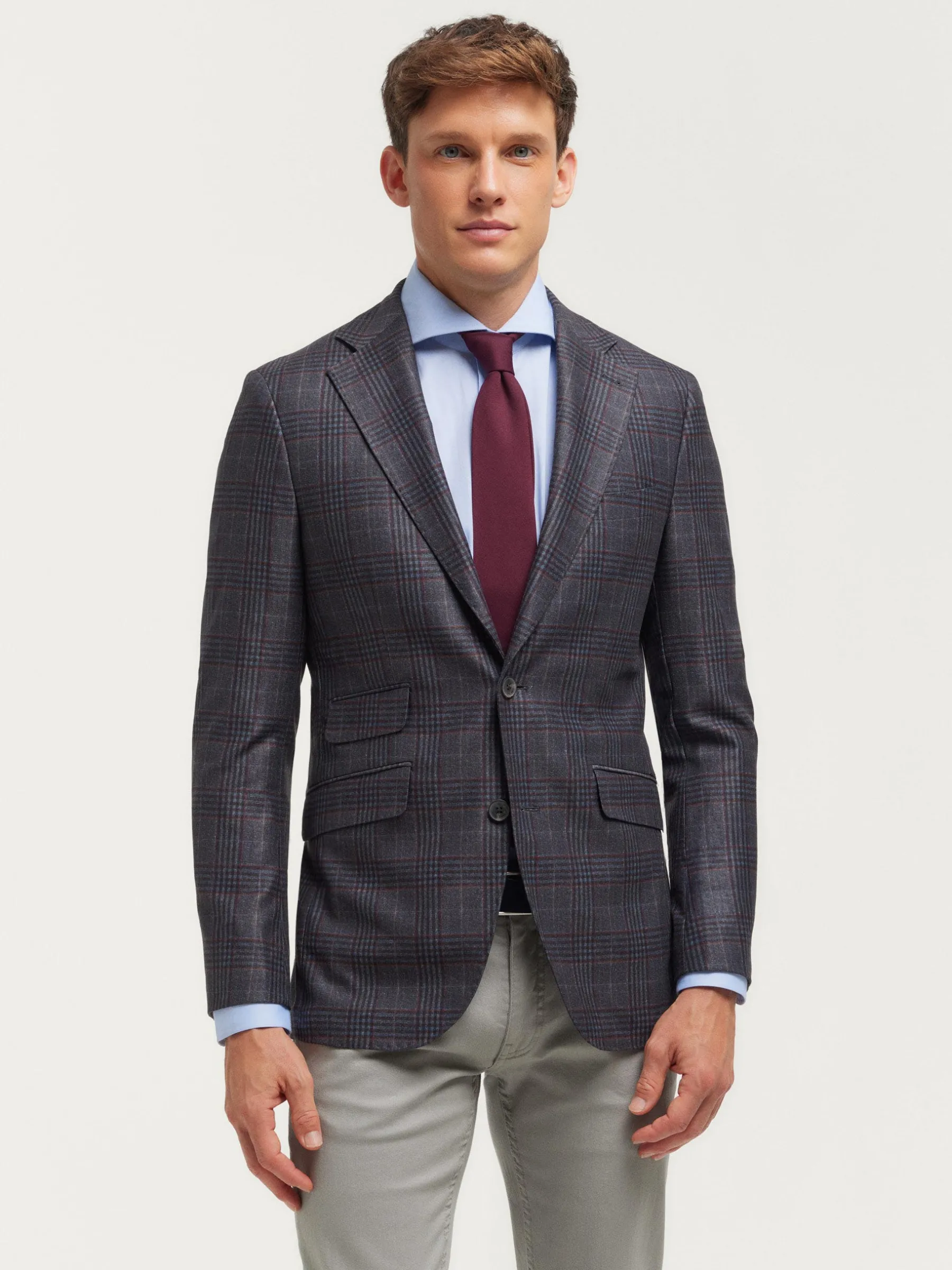 Americana confeccionada en tejido a cuadros de corte slim fit. Cuenta con cuello y solapa, cierre central simple mediante dos botones y puños con botones decorativos. Pinzas en el frontal, tres bolsillos de solapa en la cintura y un bolsillo a la altura del pecho. Dos bolsillos en el interior.