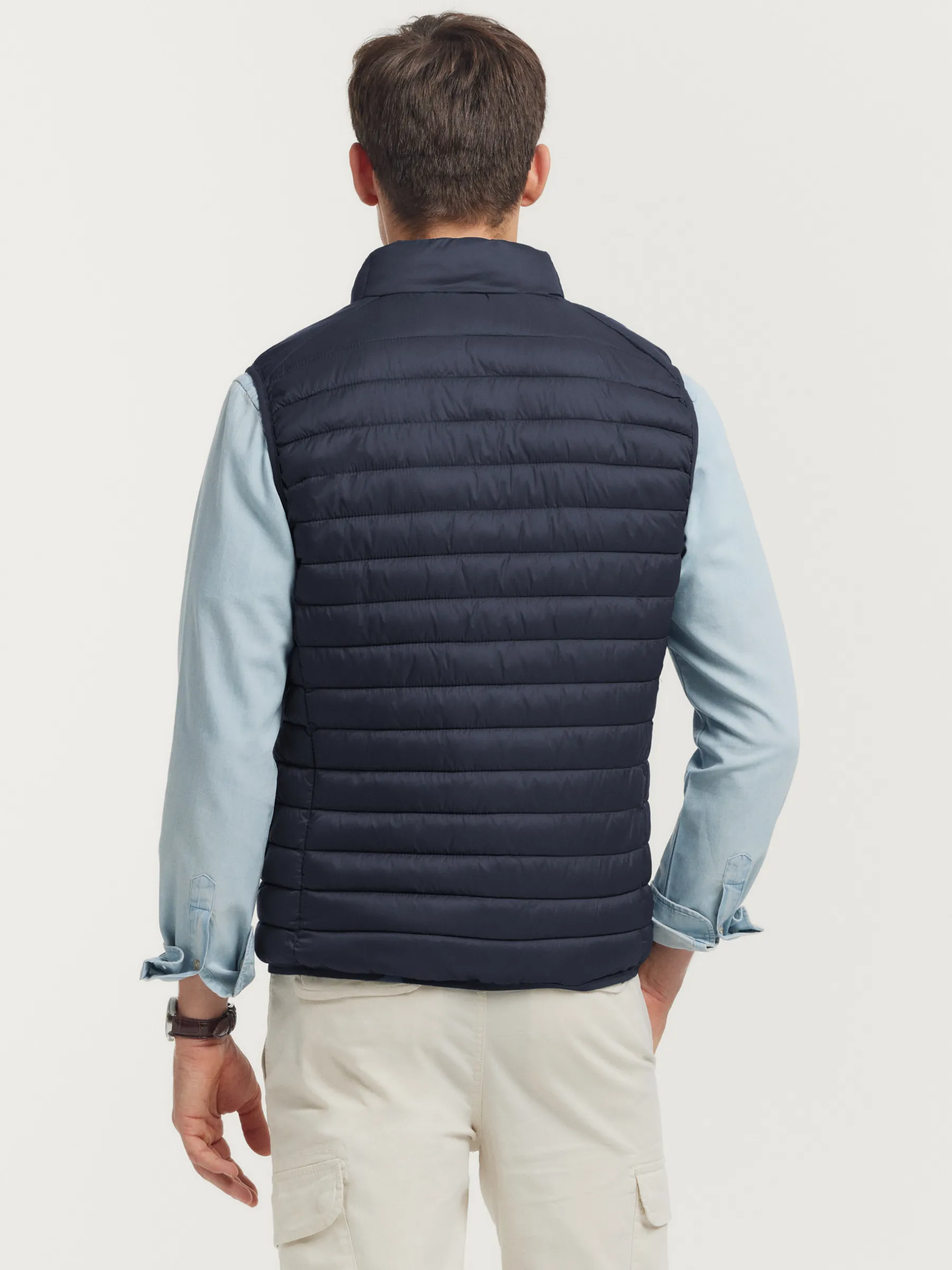 Chaleco acolchado con cuello subido y cierre central mediante cremallera, dos bolsillos a la altura de la cintura y logo de la marca grabado en el pecho. Elástico en la sisa y cintura. Forro interior a contraste con bolsillos.