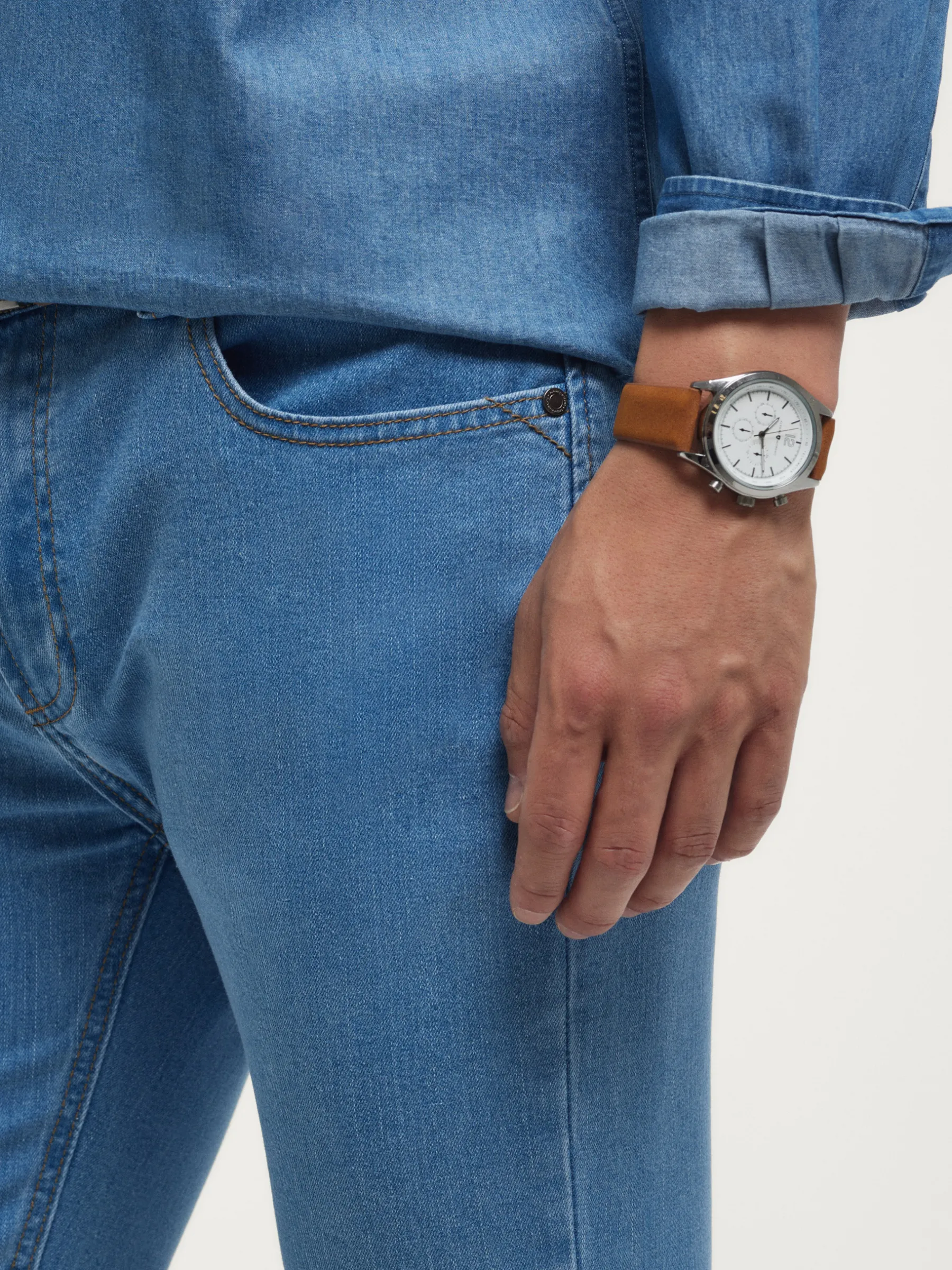 Pantalón denim de corte regular fit con cinco bolsillos y cierre central mediante botón y cremallera, pespuntes en color camel, fornituras personalizadas y etiqueta en efecto piel en la cinturilla.