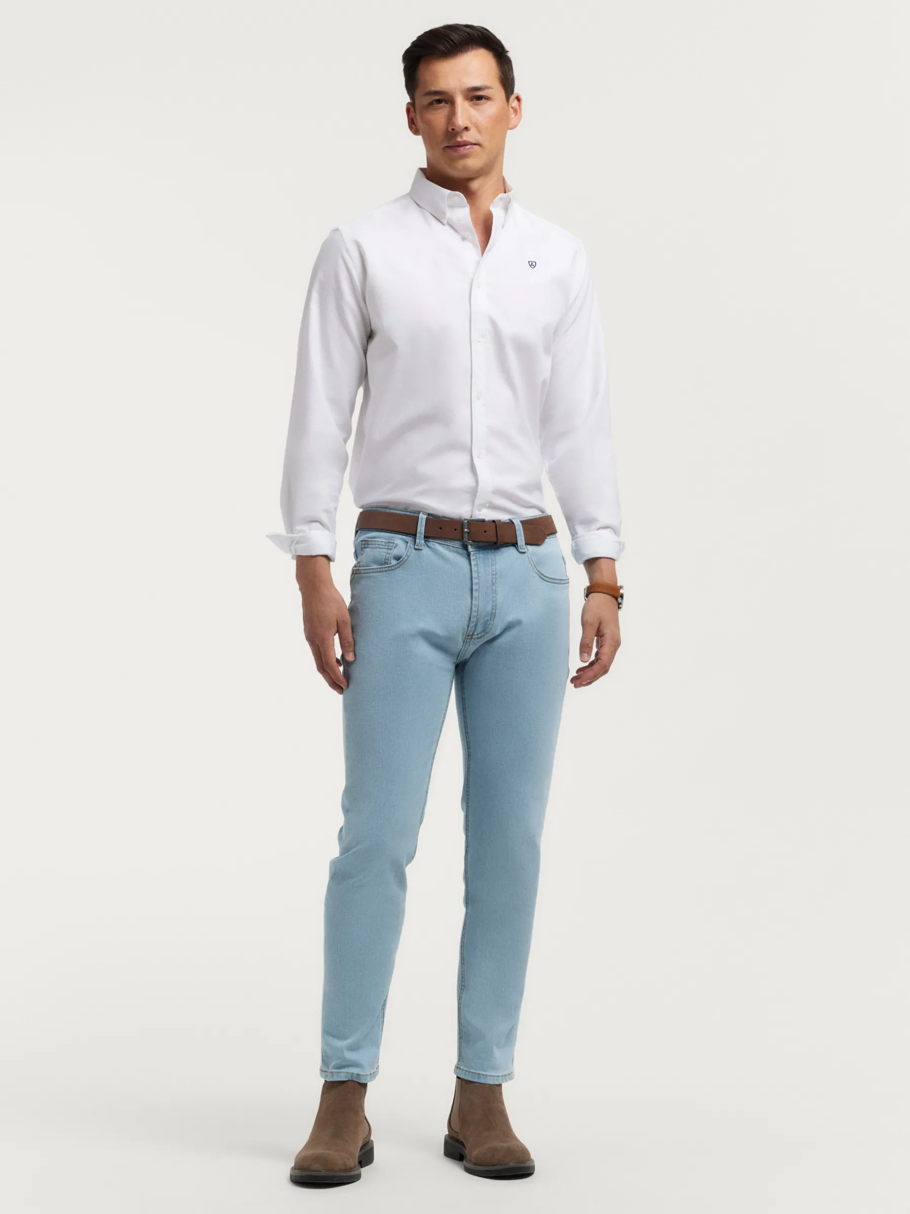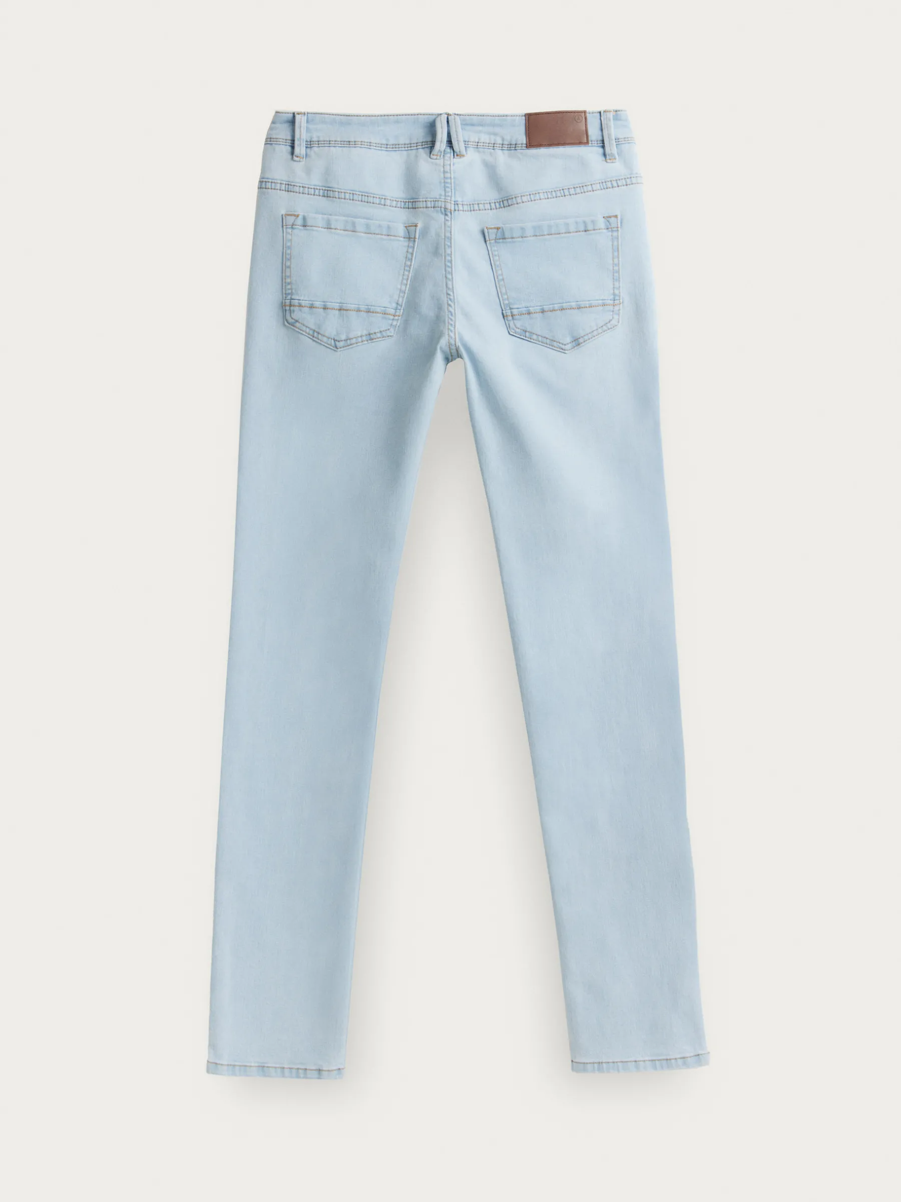 Pantalón denim de corte regular fit con cinco bolsillos y cierre central mediante botón y cremallera, pespuntes en color camel, fornituras personalizadas y etiqueta en efecto piel en la cinturilla.